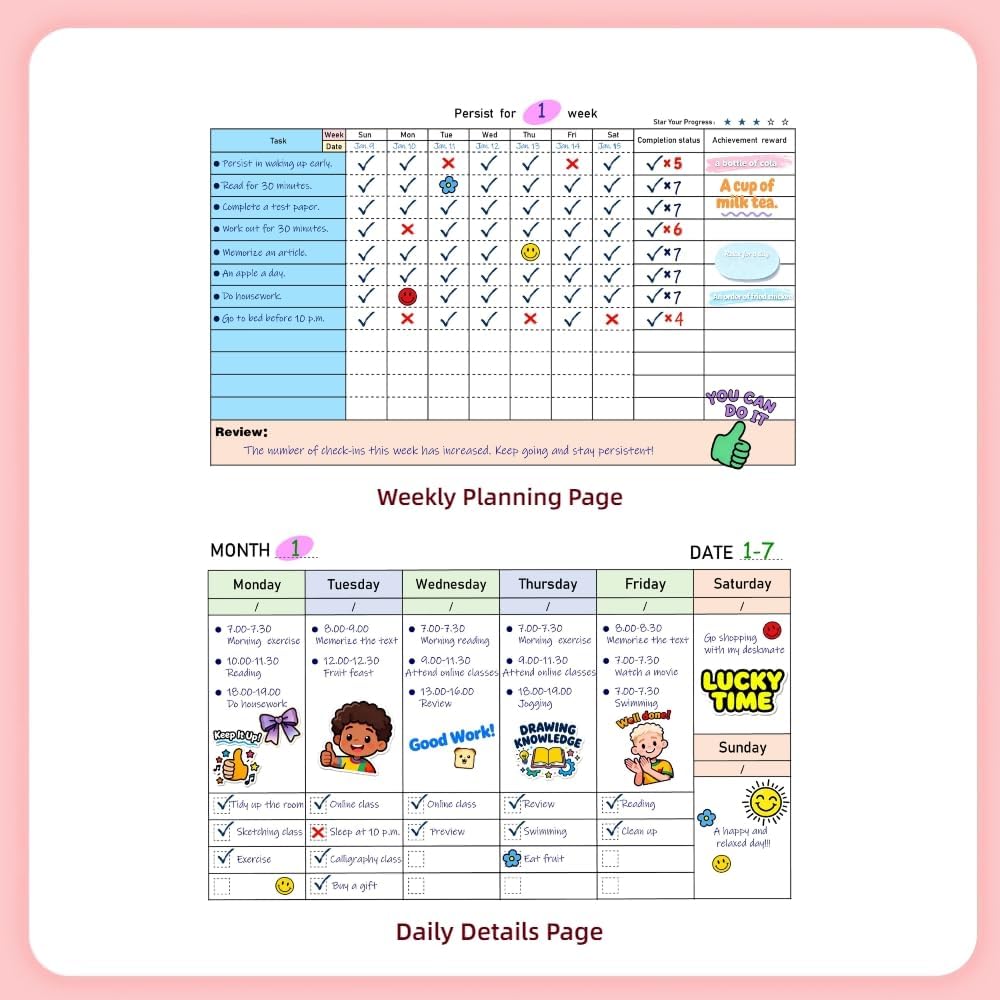 Equipped with a visual goal-setting section, daily check-in areas, and a point-based reward mechanism, it motivates teens to track progress independently. Parents can join in with feedback and incentives, providing positive reinforcement during crucial habit-forming years to make self-discipline engaging and effective.