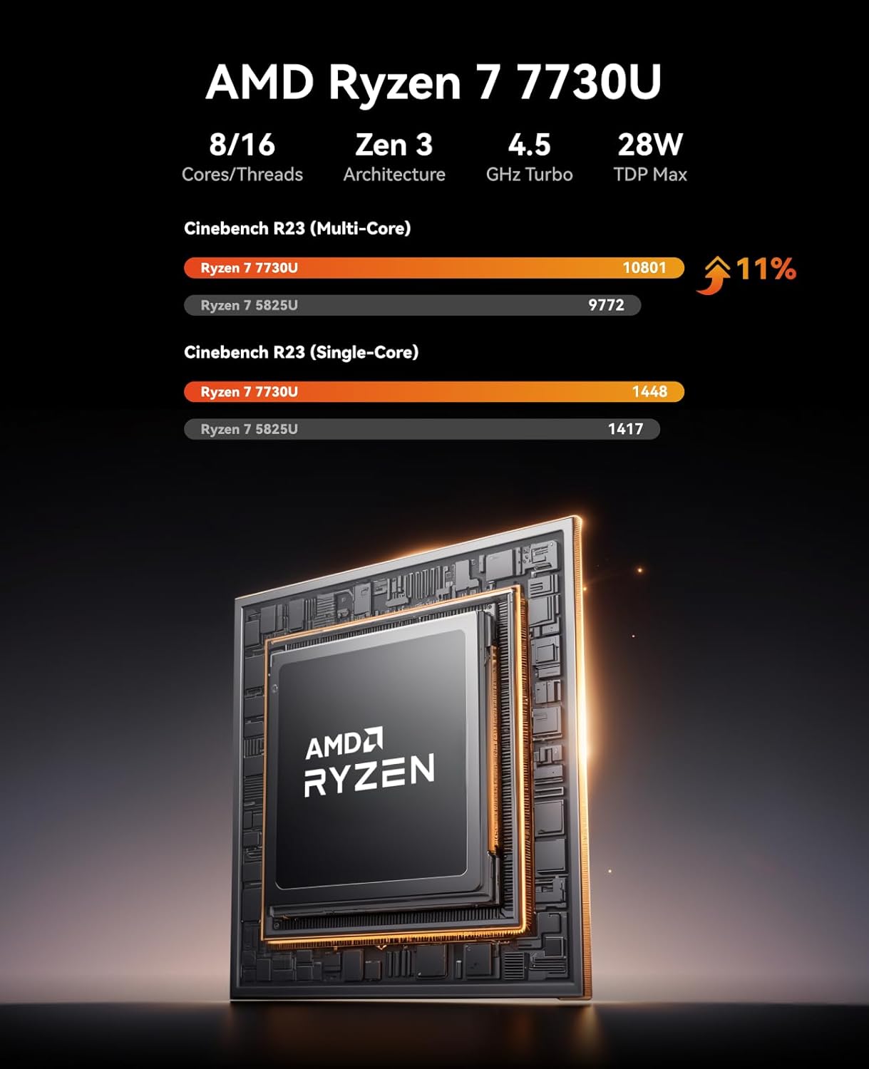 [AMD RYZEN 7 7730U PROCESSOR] ACEMAGICIAN Micro PC is equipped with AMD Ryzen 7 7730U processor (8C/16T, 16M Cache, up to 4.5GHz). Compared with AMD Ryzen 5(7430U/5600U/5500U)&Ryzen 7(5825U/5800U/5700U), K1 MINI PC 7730U CPU performance +35%, GPU +38%, more powerful performance and smoother running