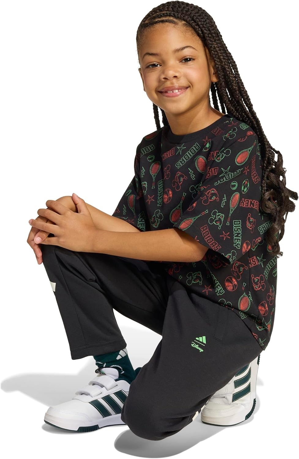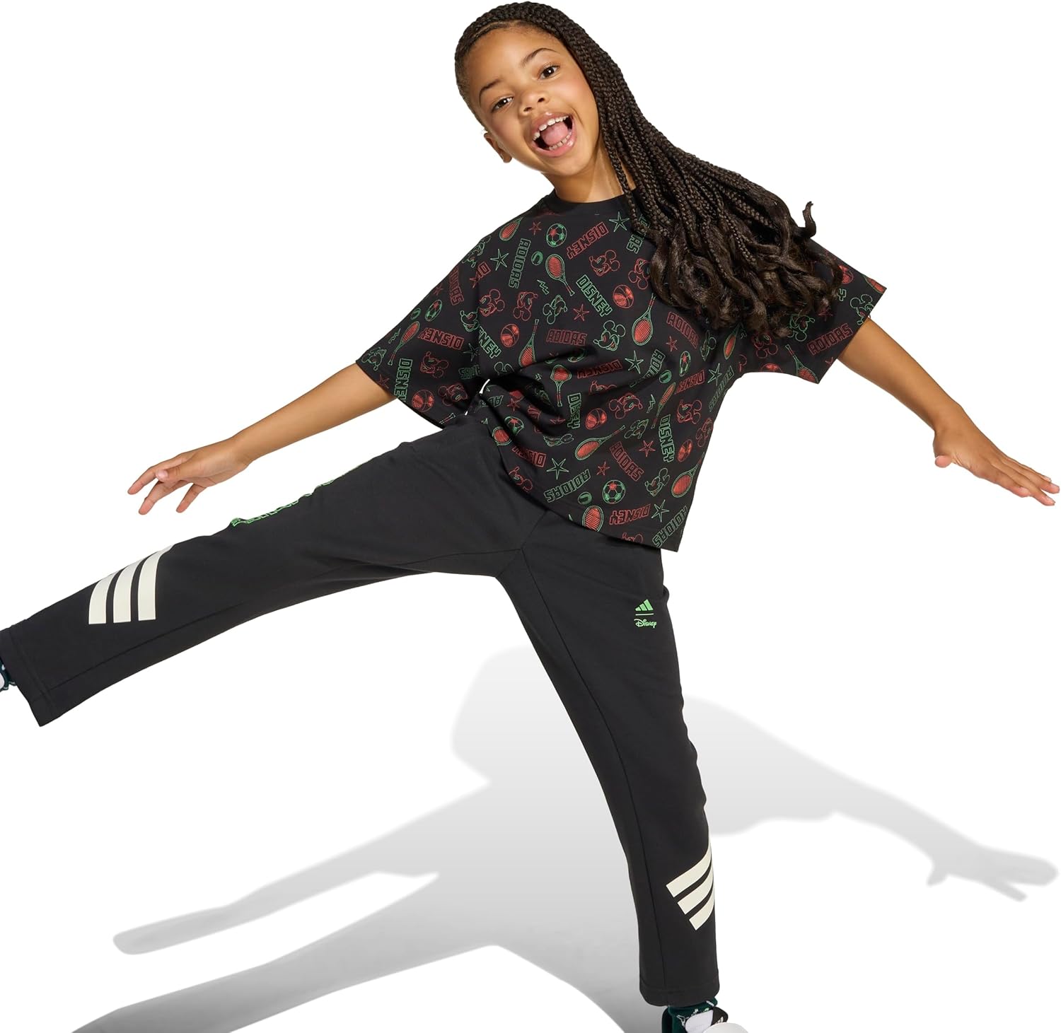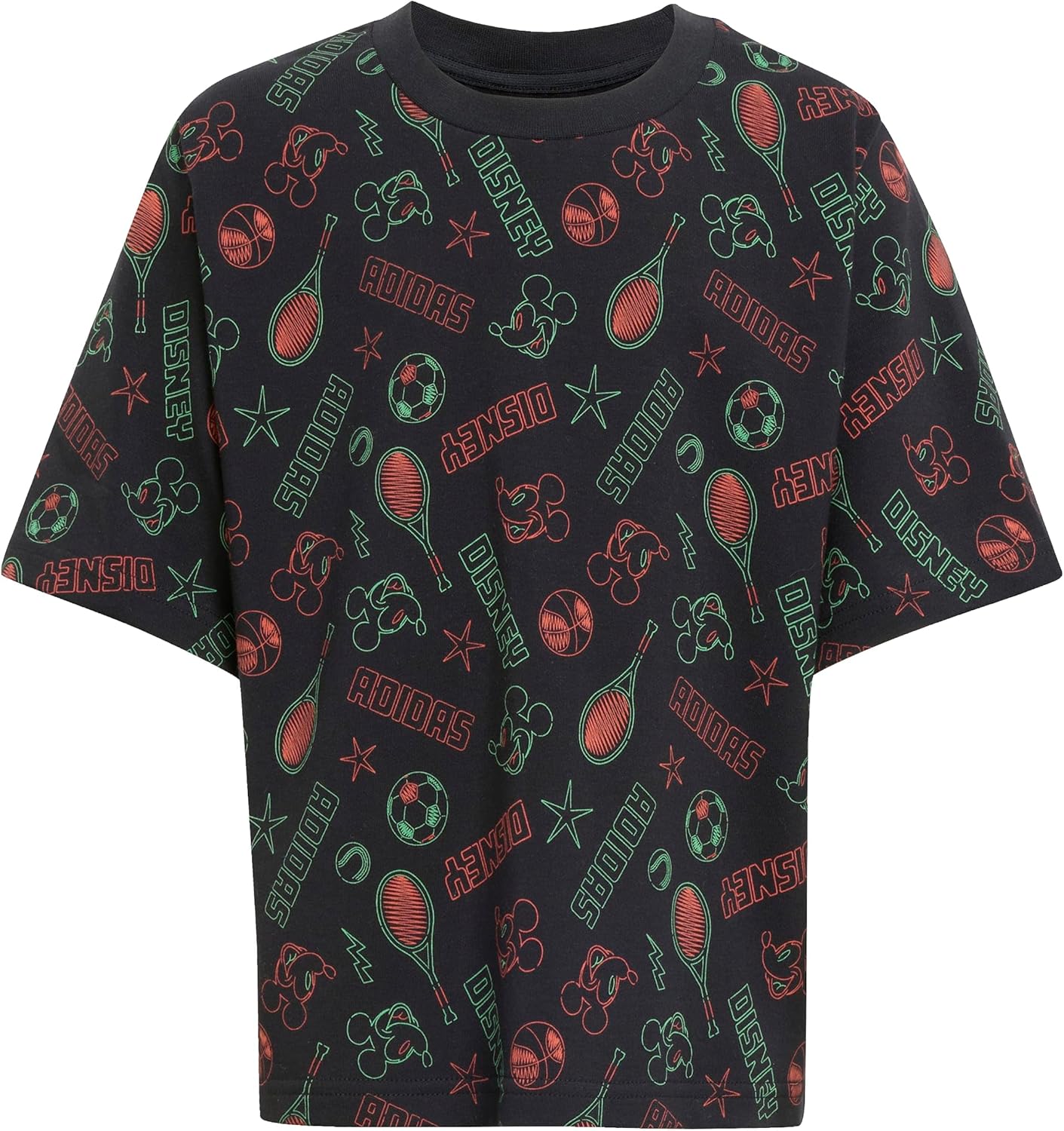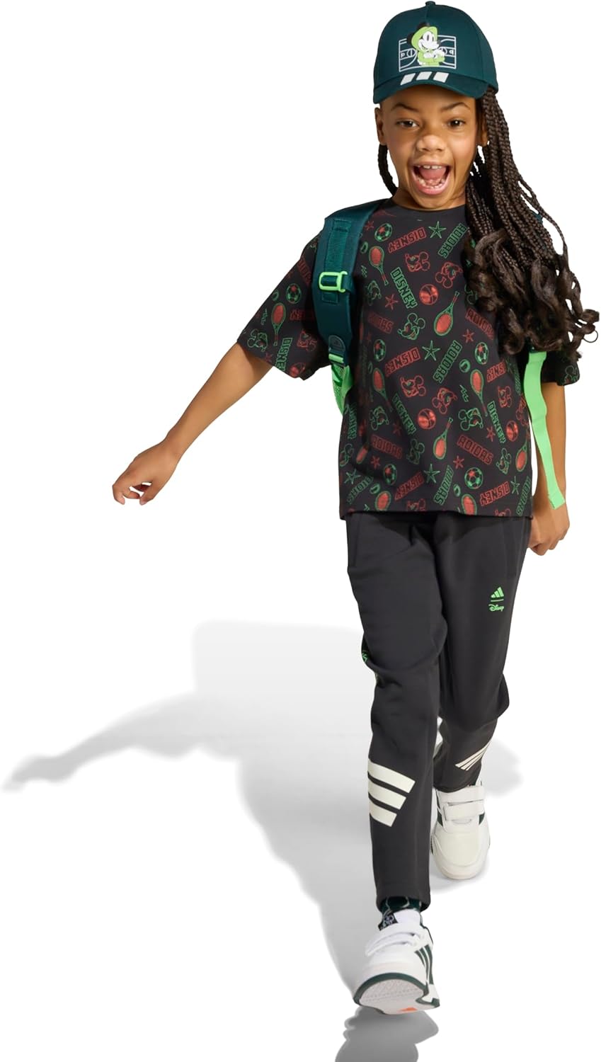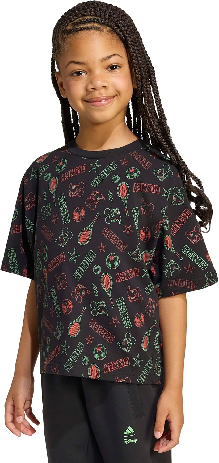 Set them up for the day with the signature style of Disney’s Mickey Mouse. This kids’ adidas t-shirt fits a bit loose so they can run and play in comfort. Mickey and Friends graphics on the front and back let them show off their favorite cartoon characters.
