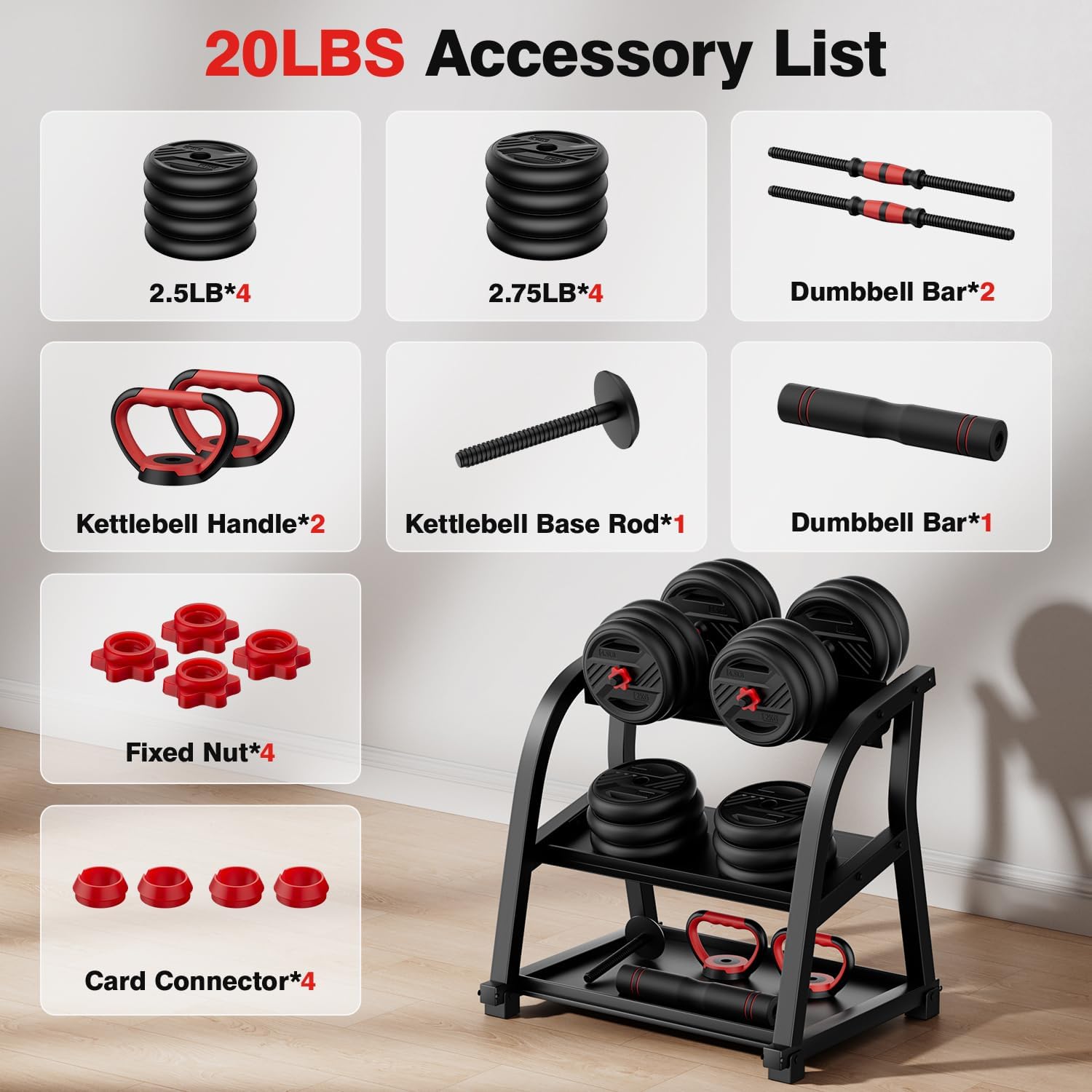 Free Choice of Weight: The detachable design enhances the usability and flexibility of these adjustable dumbbells. The adjustable dumbbell set includes dumbbells that adjust from 2-10 lbs, barbells from 5-20 lbs, and kettlebells from 2.5-11 lbs, effectively meeting your diverse exercise needs across different fitness stages.