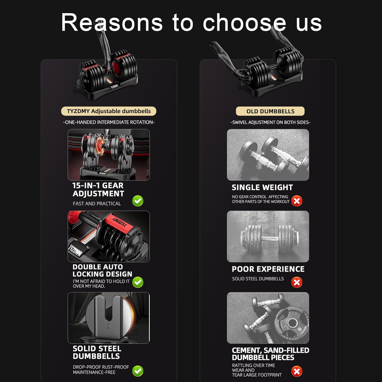 【Double auto-locking design】Double safety locks, anti-fall design, must be rotated on the base to adjust the weight, automatically lock when lifting the dumbbells, exercise is more secure, lifting over the head is not afraid of