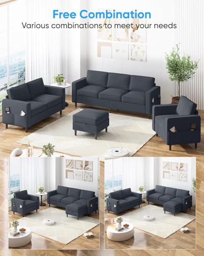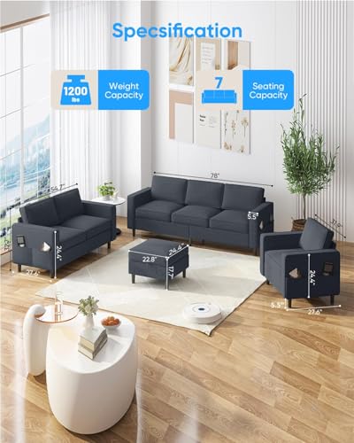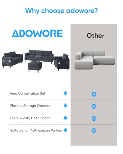 ADOWORE 3 Pieces Sofa Sets Furniture for Living Room, Linen Fabric 3 Seater Sofa with Ottoman and Loveseat and Armchair Sets, Modern L Shaped Couch + Love Seat + Accent Chair Sets, Dark Grey
