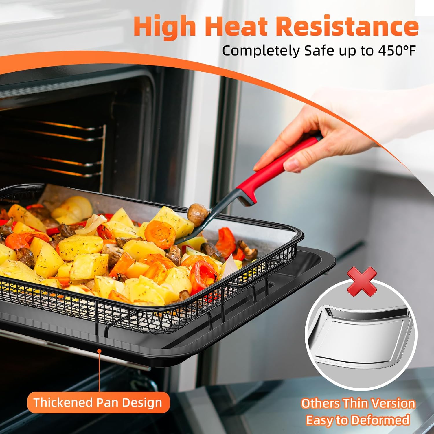 【2 Set for Faster Cooking】2 different size of air fryer tray for oven measuring means you can cook more food at once, saving you time and energy. Whether you’re feeding a family or entertaining guests,this crisper tray and basket set can handle it all.