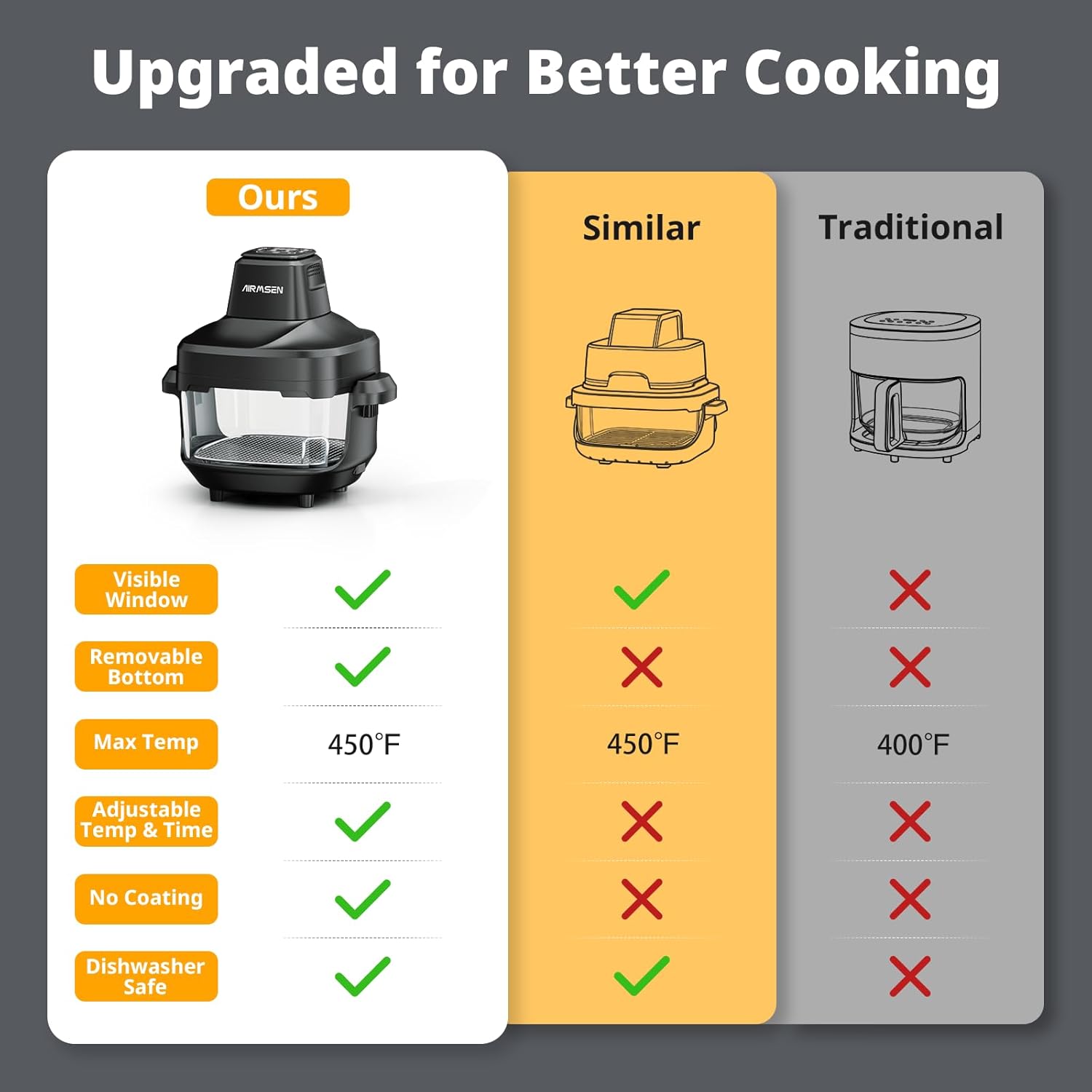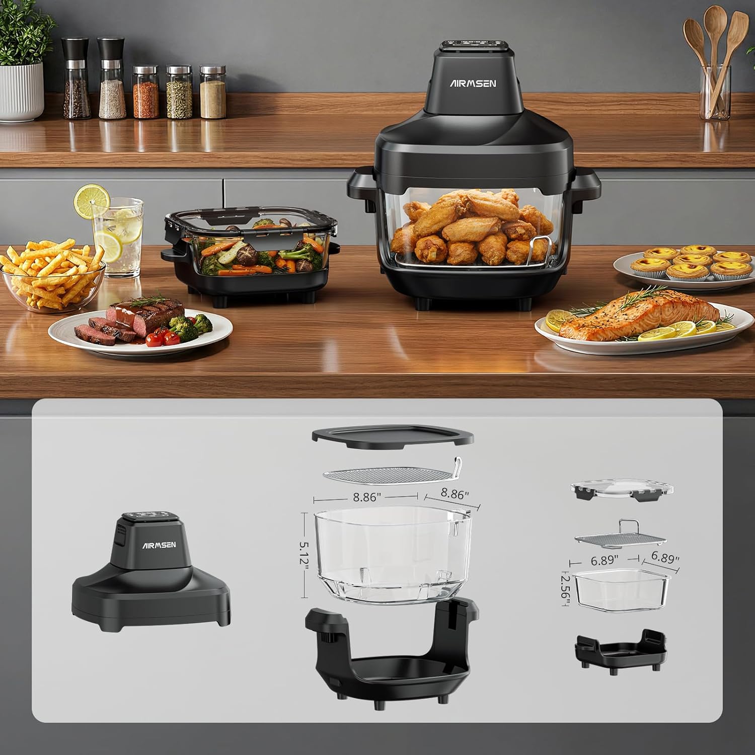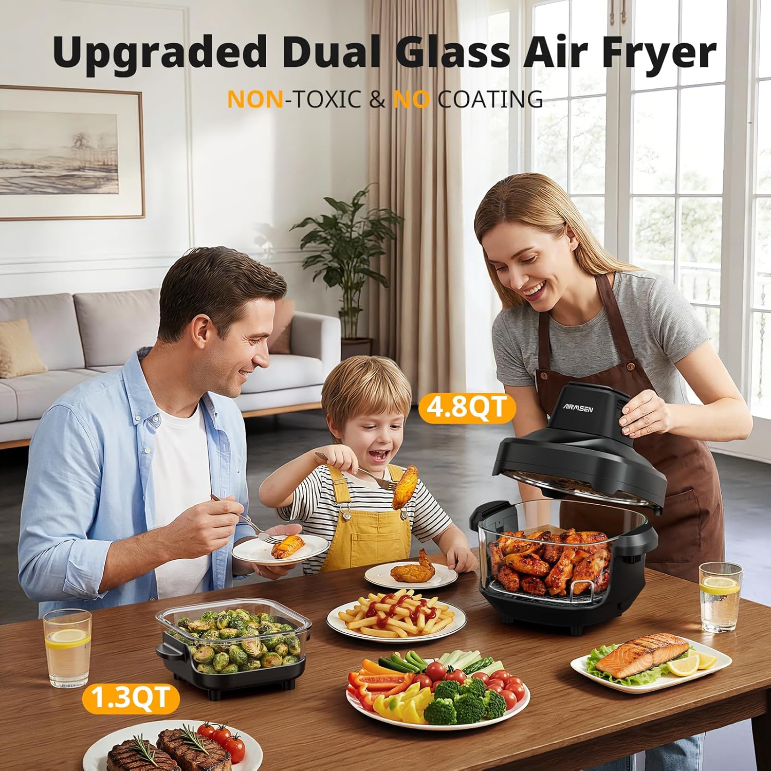 AIRMSEN Potable Glass Air Fryer Non-Toxic, 4.8QT & 1.3QT, 4 Presets & Manual Control, 140–450℉ Precise Heat, 95% Less Oil, Auto-Pause & Resume, Microwave & Dishwasher Safe