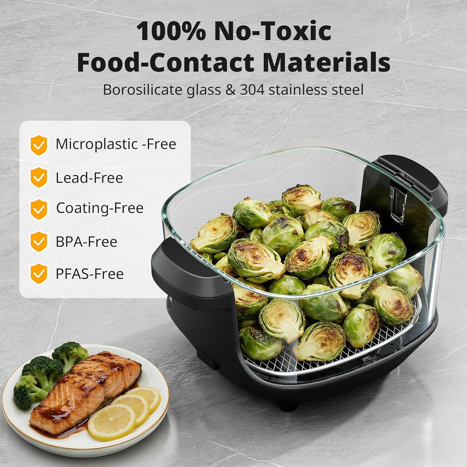 100% Non-Toxic & Chemical-Free: Experience pure cooking with a high-heat resistant glass bowl and an 18/8 stainless steel crisper tray. This unit is completely coating-free, meaning NO PFAS, PTFE, or harmful heavy metals. You get a safe, healthy contact with your food every single time.