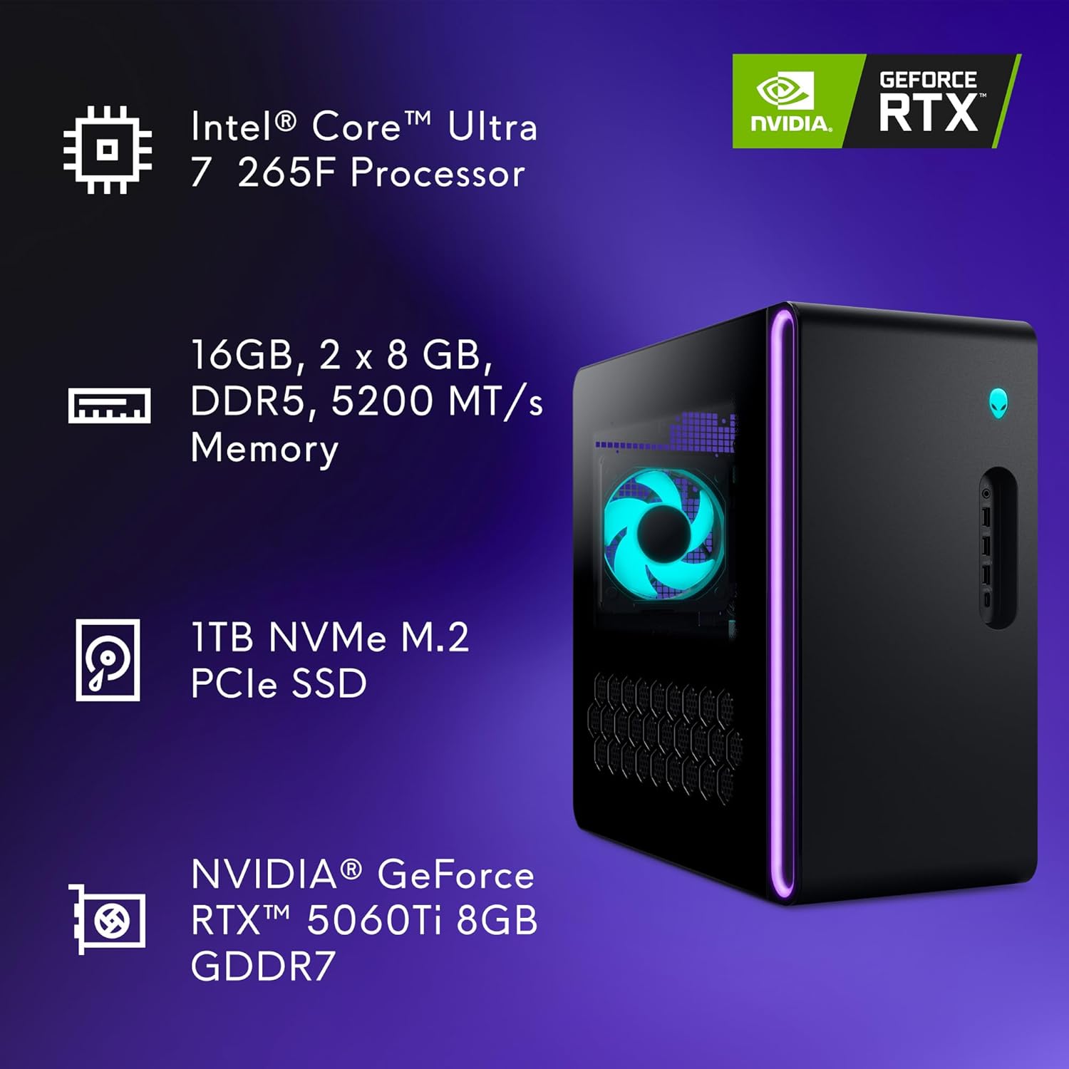 Specification: Alienware Aurora Gaming Desktop ACT1250 – Intel Core Ultra 7 265KF Processor, Air Cooled, NVIDIA GeForce RTX 5060Ti, 16GB DDR5 RAM, 1TB SSD, 500W Platinum Rated PSU, Windows 11 Home – Clear Panel