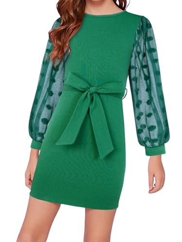 ALLIFly Green Dresses for Girls Size 9-10 Fall Dresses for Kids Casual Winter Dress Mesh Sleeve Self Belted Round Neck