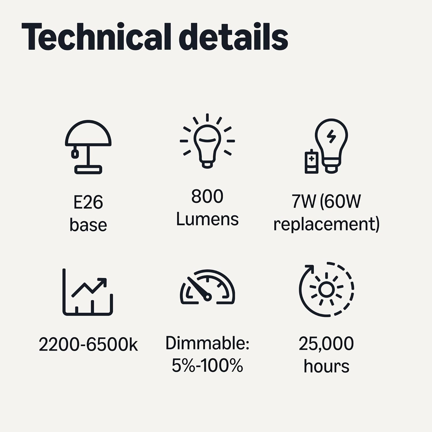 TUNABLE AND DIMMABLE: Features a tunable range from warm white (2200K) to cool white (6500k) and a dimmable range from 5% to 100% to create custom settings; allows you to choose from different shades of warm to cool light to create the best ambience for your activities. Note: bulbs are dimmable via Alexa app or voice control only (not compatible with a physical dimmer/dimmable lighting luminaires.)