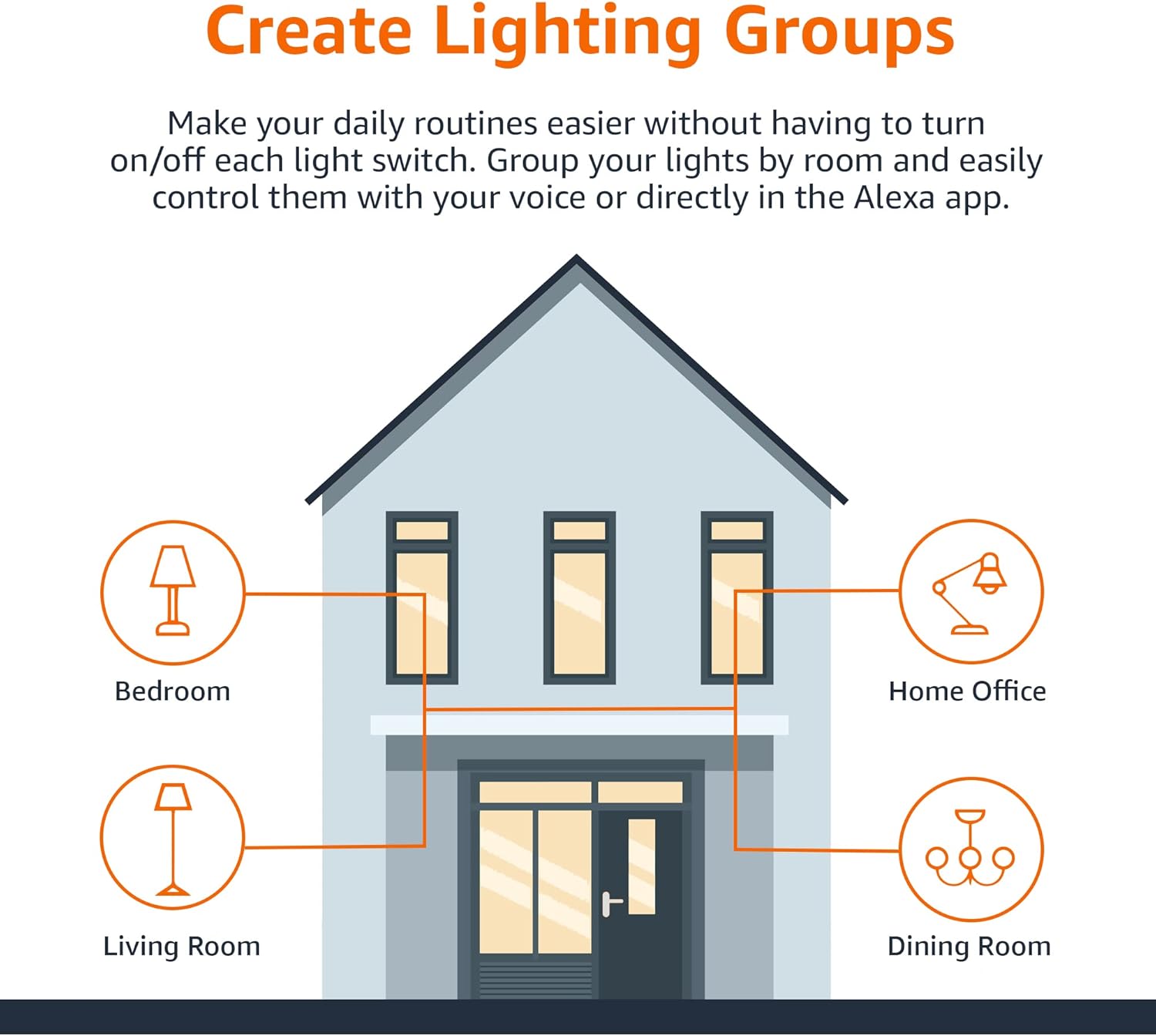 GROUP CONTROL: Create groups in the Alexa app to combine lights together, allowing you to control lights by each room, or all of your home lights with a single voice command or via app. When it’s time to sleep, just say “Alexa, turn off the bedroom” OR use the Alexa app to turn off the bedroom lights at once.