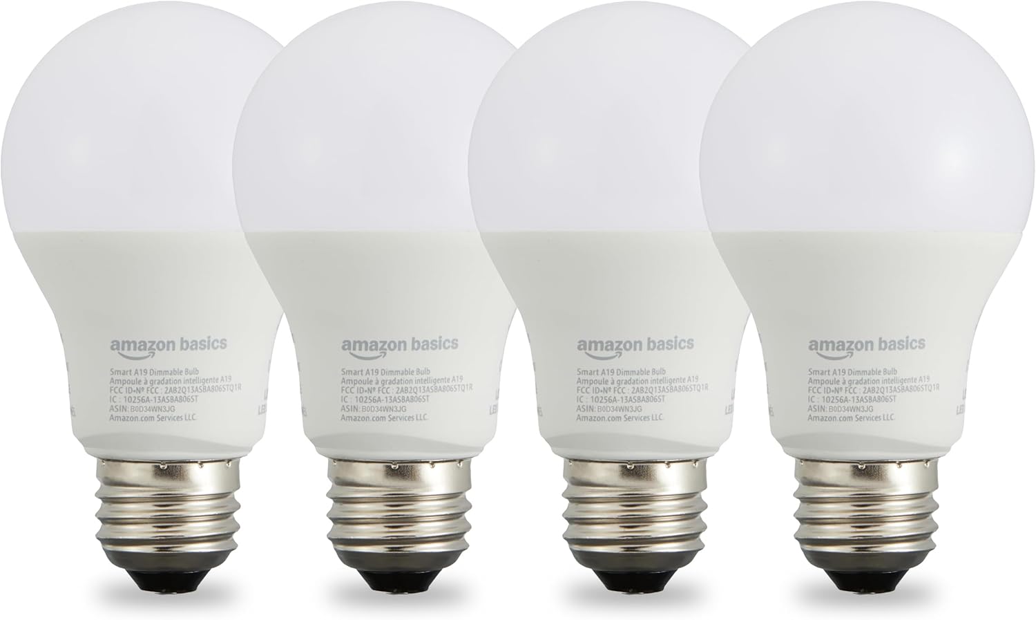 Amazon Basics Smart A19 LED Light Bulb, Dimmable Soft White (2700K), 9W (60W Equivalent), 800LM, Works with Alexa Only, 2.4 GHz Wi-Fi, No Hub Required, 4 Pack