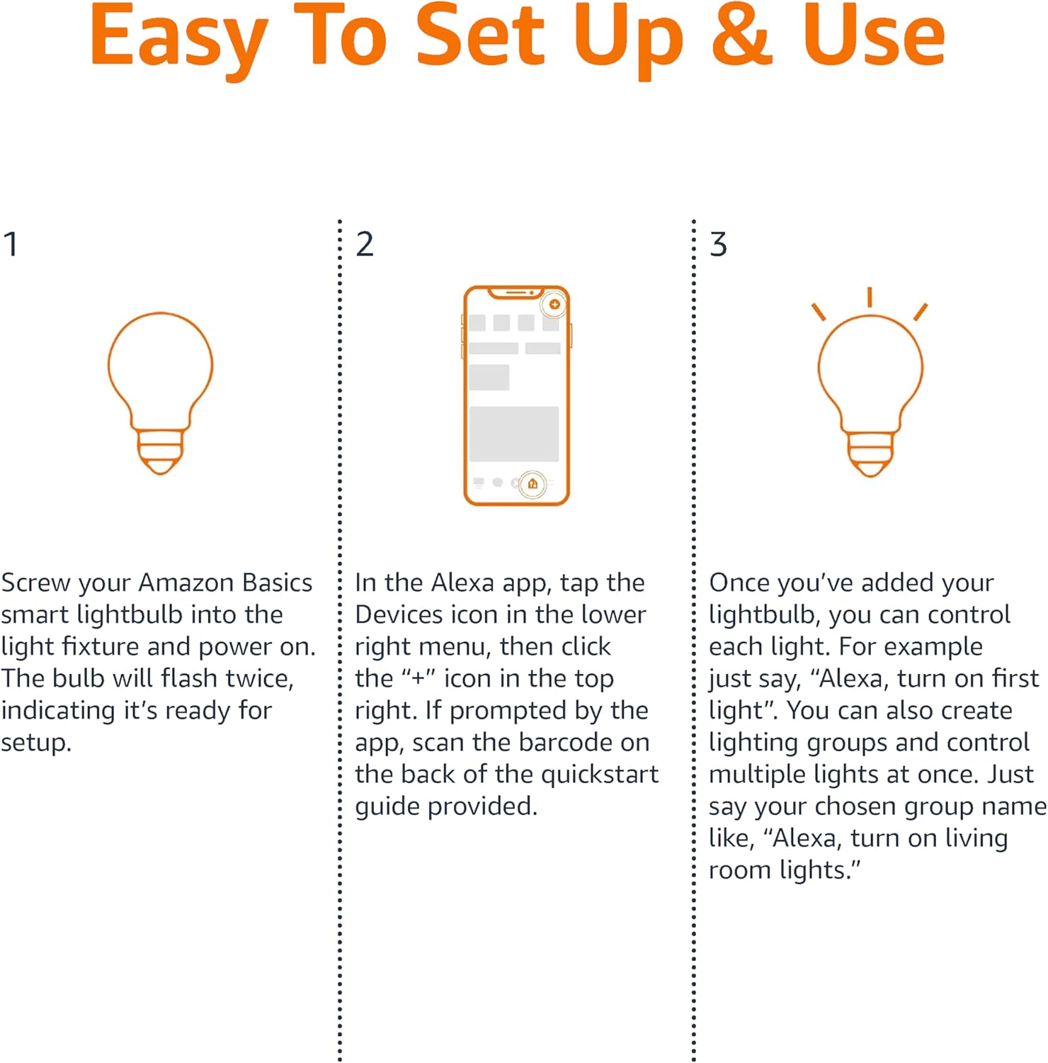 Specification: Amazon Basics Smart A19 LED Light Bulb, Dimmable Soft White (2700K), 9W (60W Equivalent), 800LM, Works with Alexa Only, 2.4 GHz Wi-Fi, No Hub Required, 4 Pack
