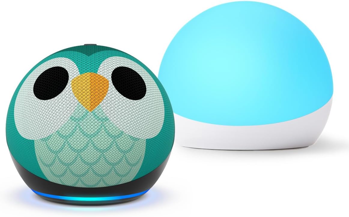 This bundle contains Echo Dot (5th gen) Kids in Owl and Echo Glow, now with matching Night Owl lighting mode.