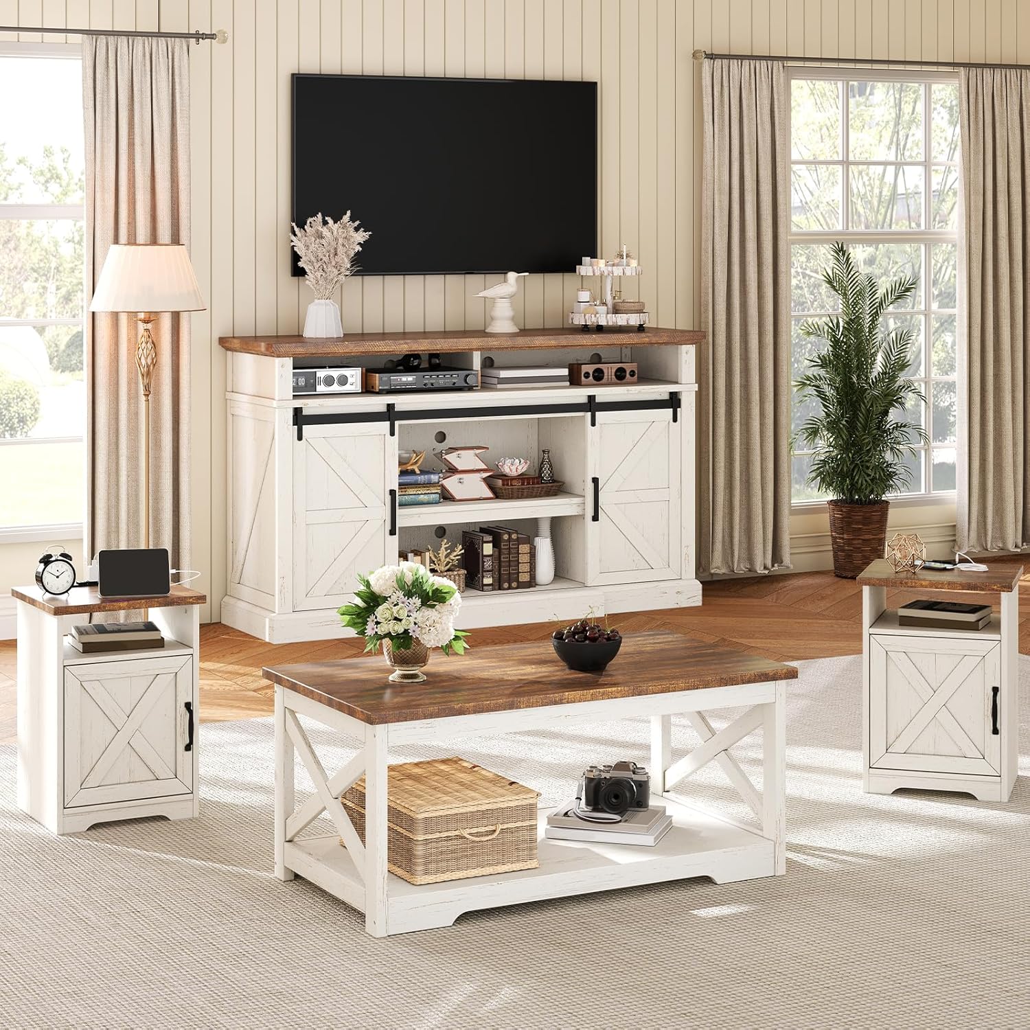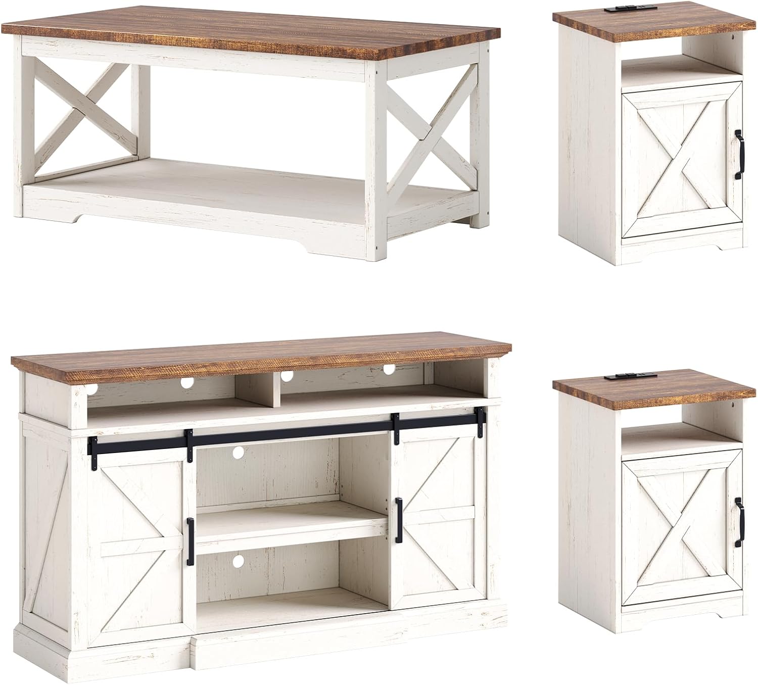 AMERLIFE 4-Piece Farmhouse Living Room Furniture Set with 66″ TV Stand, Coffee Table & 2 End Tables, Barn Door Design, Large Storage Shelves, Built-in Charging Station & USB Ports, Distressed White