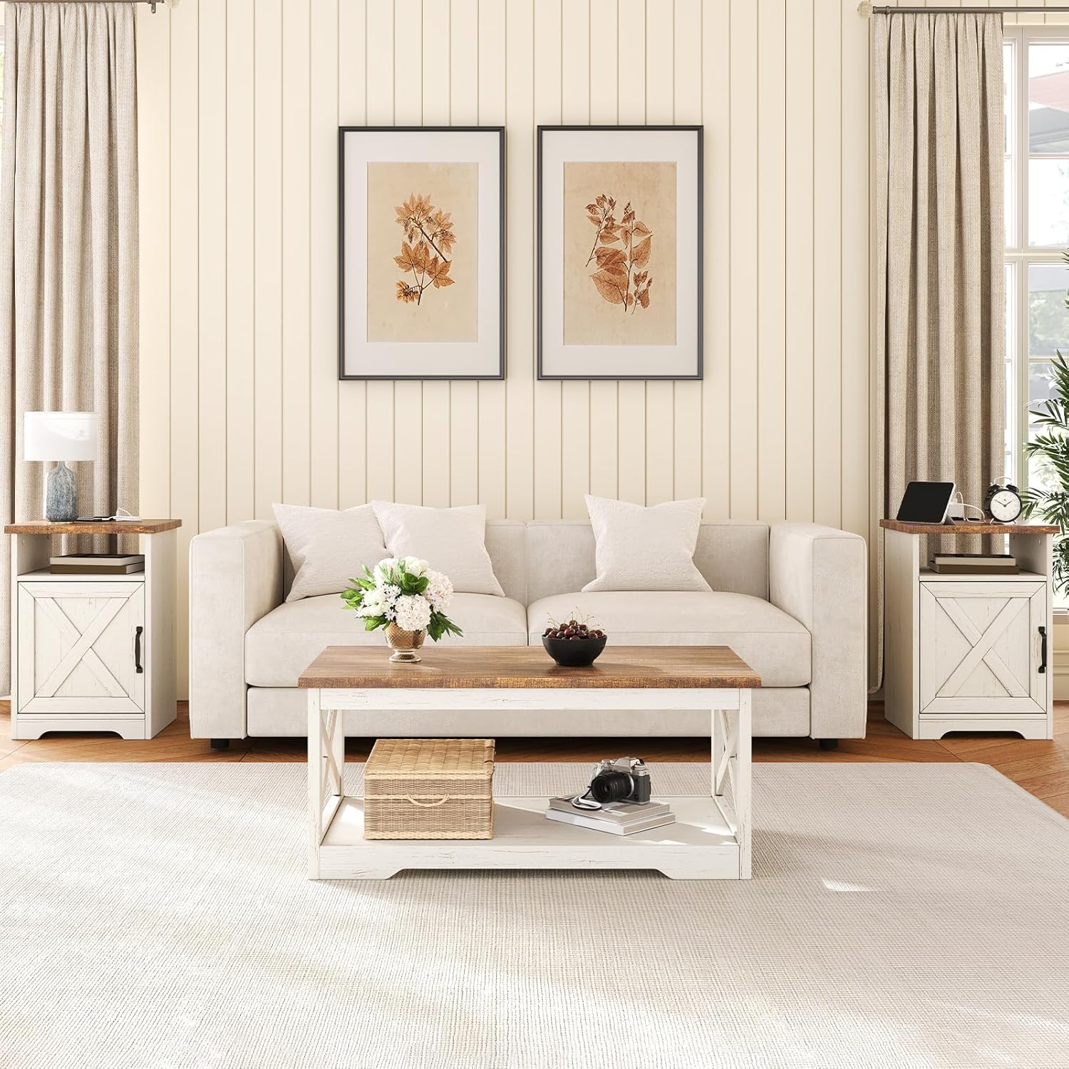 Specification: AMERLIFE 4-Piece Farmhouse Living Room Furniture Set with 66″ TV Stand, Coffee Table & 2 End Tables, Barn Door Design, Large Storage Shelves, Built-in Charging Station & USB Ports, Distressed White