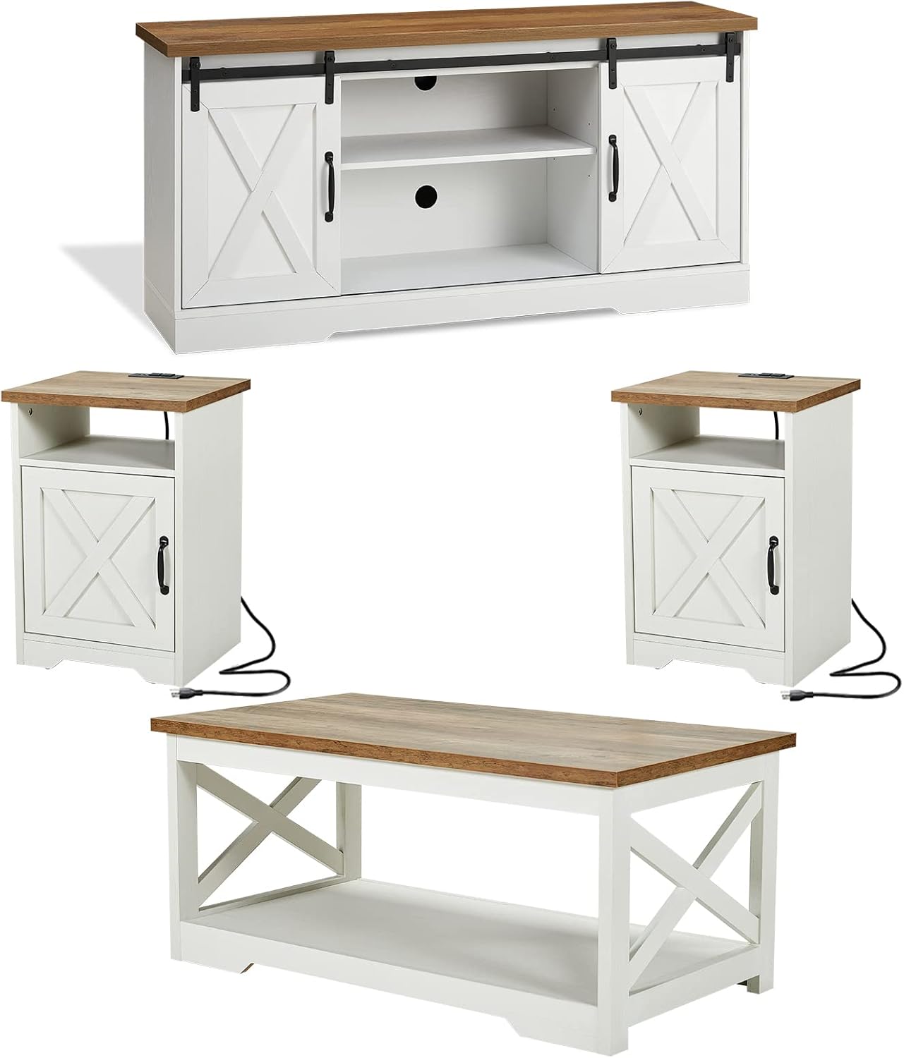 Specification: AMERLIFE 4-Piece Farmhouse Table Set Includes Sliding Barn Door TV Stand, Coffee Table& Two End Tables, Side Table with Charging Station and USB Ports, for Living Room, Distressed White, 66″