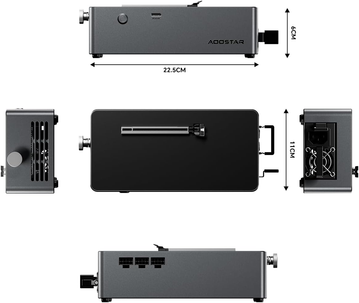 【AG01 EGPU Dock Features】 The AOOSTAR AG01 external GPU docking station has a built-in Huntkey 800W power supply. The maximum power consumption of the graphics card is 600W, so it basically meets the needs of most existing graphics cards. AG01 eGPU dock adopts an open metal body design with aluminum profile center frame, size 22.5 x 11 x 6cm, weight 1.5KG, and unlimited graphics card length.