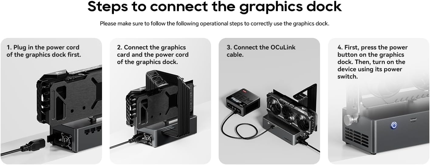 【AG01 EGPU Dock Compatibility】The AG01 eGPU docking station is compatible with most external graphics boards on the market today. Note: This external GPU dock is only compatible with devices with an Oculink port. Please check in advance.