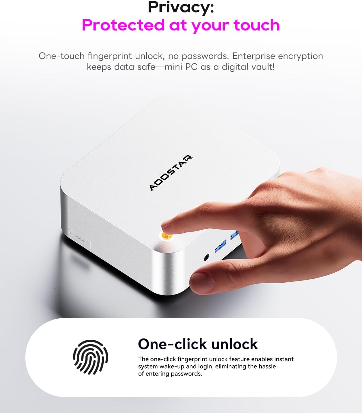 【One-Touch Fingerprint Unlock 】The AOOSTAR MACO Mini PC features a convenient one-touch fingerprint unlock for instant access and enhanced security. Simply touch to wake and log in — no passwords needed. With enterprise-grade encryption technology, your personal and business data remain fully protected, turning your mini PC into a secure “digital vault.