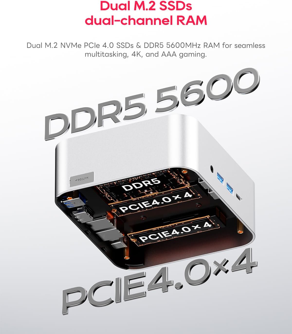 【Dual DDR5 & Dual PCIe4.0】The Mini Gaming Pc built in Dual-channel DDR5 5600MHz( Expandable to 128GB), Dual-channel M.2 2280 NVMe PCIe4.0x4 SSD( Expandable to 8 TB). Providing ample storage for files, pictures, videos, games, and more, This setup ensures smooth execution of resource-intensive applications, reducing load times and enhancing overall system responsiveness.