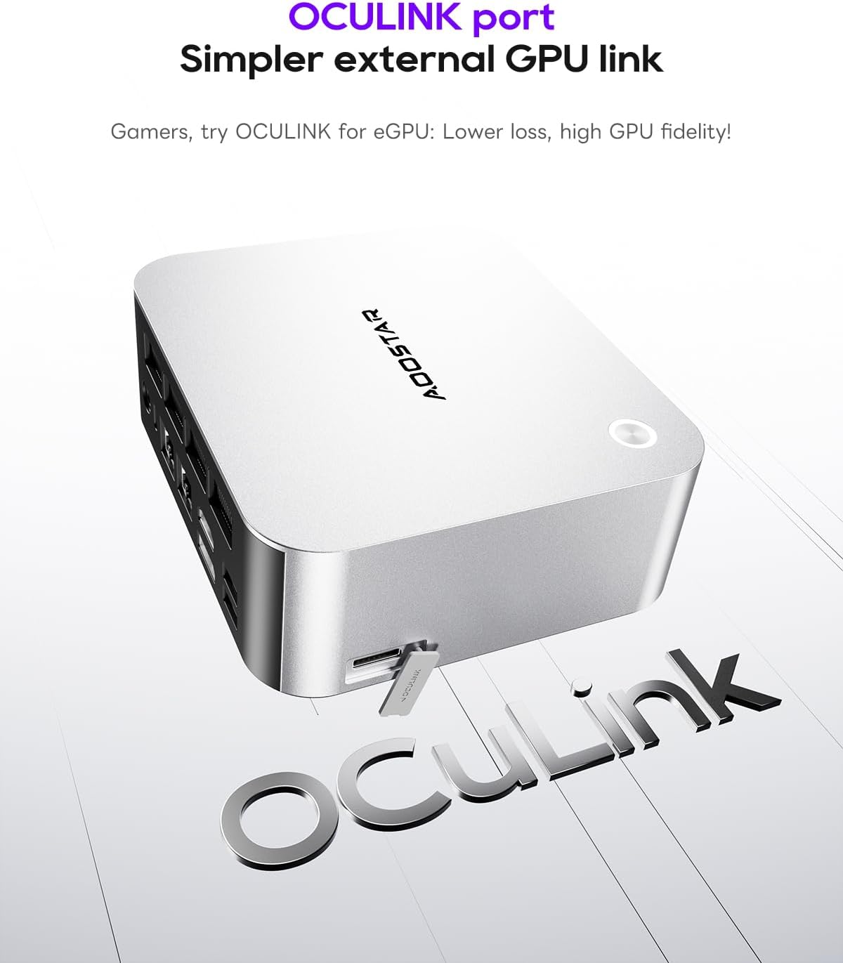 【Ultra-Fast Transfer Speed】MACO 8945HS desktop computers was equipped with extremely high bandwidth OCulink port (64 Gbps) . This provides an external GPU solution with faster support speeds and fewer transfer bottlenecks compared to Thunderbolt 4 and USB4(Little to no graphics card loss below 4070ti). Note: *Non-hot-swappable, OCulink does not occupy ONE M.2 2280 PCIe4.0 SSD slot.