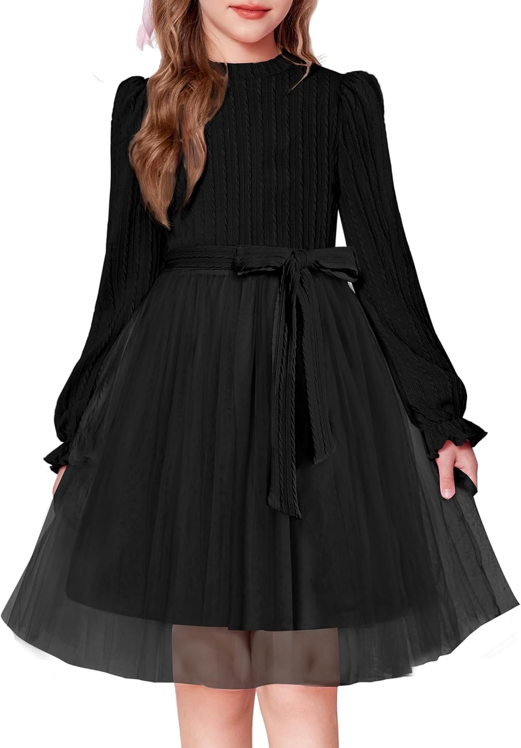 Arshiner Girls Tulle Dress Puff Long Sleeve Mock Neck Cable Knit Sweater Formal Casual Fall Winter Tutu Dresses with Belt