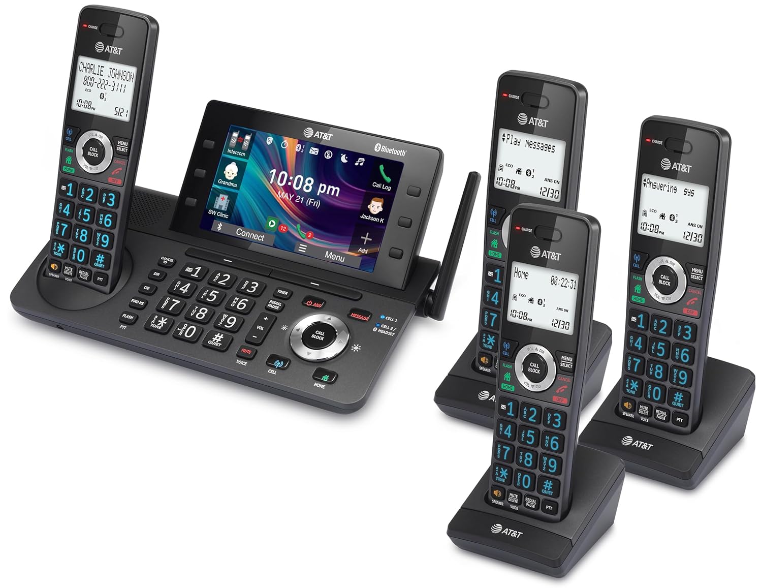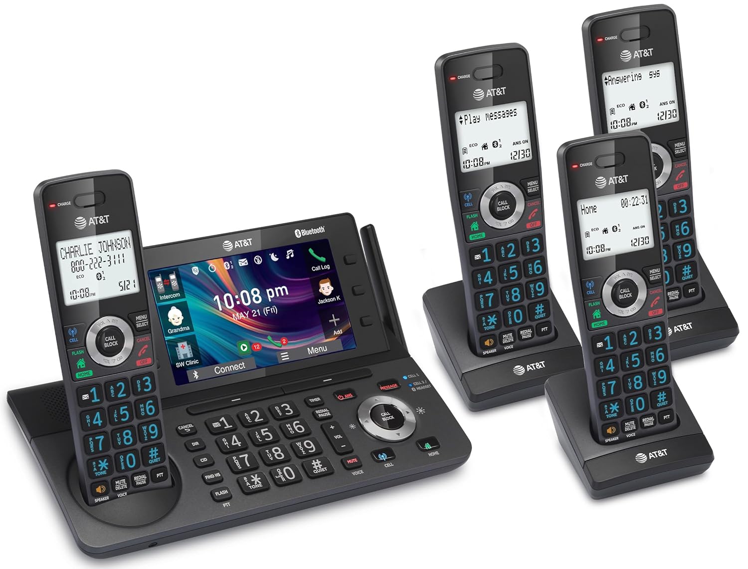 AT&T 4-Handset DECT 6.0 Cordless Home and Business Phone with Answering Machine, 5″ Color Display, One-Touch Shortcut, Conference, Intercom, Smart Call Blocker, Bluetooth Connect to Cell: DLP73490