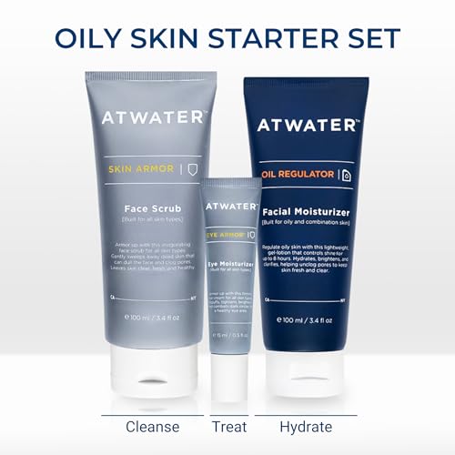 ATWATER Oily Skin Starter Set, Skin Armor Face Scrub, Eye Armor Eye Cream, and Oil Regulator Facial Moisturizer