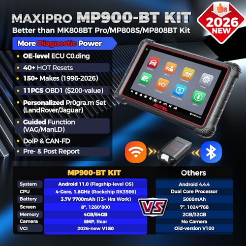 🔥【King of MaxiPRO Series, 2026 Top-Ranking Specs】Autel in 2026 unveiled MaxiPRO MP900-BT, upgrading from MS906BT/MK808S/MK808BT/MP808S/MP900: more powerful in services, more frequent upgrades, more vehicles supported! Next-level specs: Android 4.4.4à11.0; Screen 7”/1024*768à8”/1280*800; Memory 2GB/32GBà4GB/64GB; CPU 2-Coreà4-Core/1.8GHz; Battery 5000mAhà7700mAh. Includes 11 Pieces of OBD Kit for you to run OE-level diagnostics on cars before 1996.