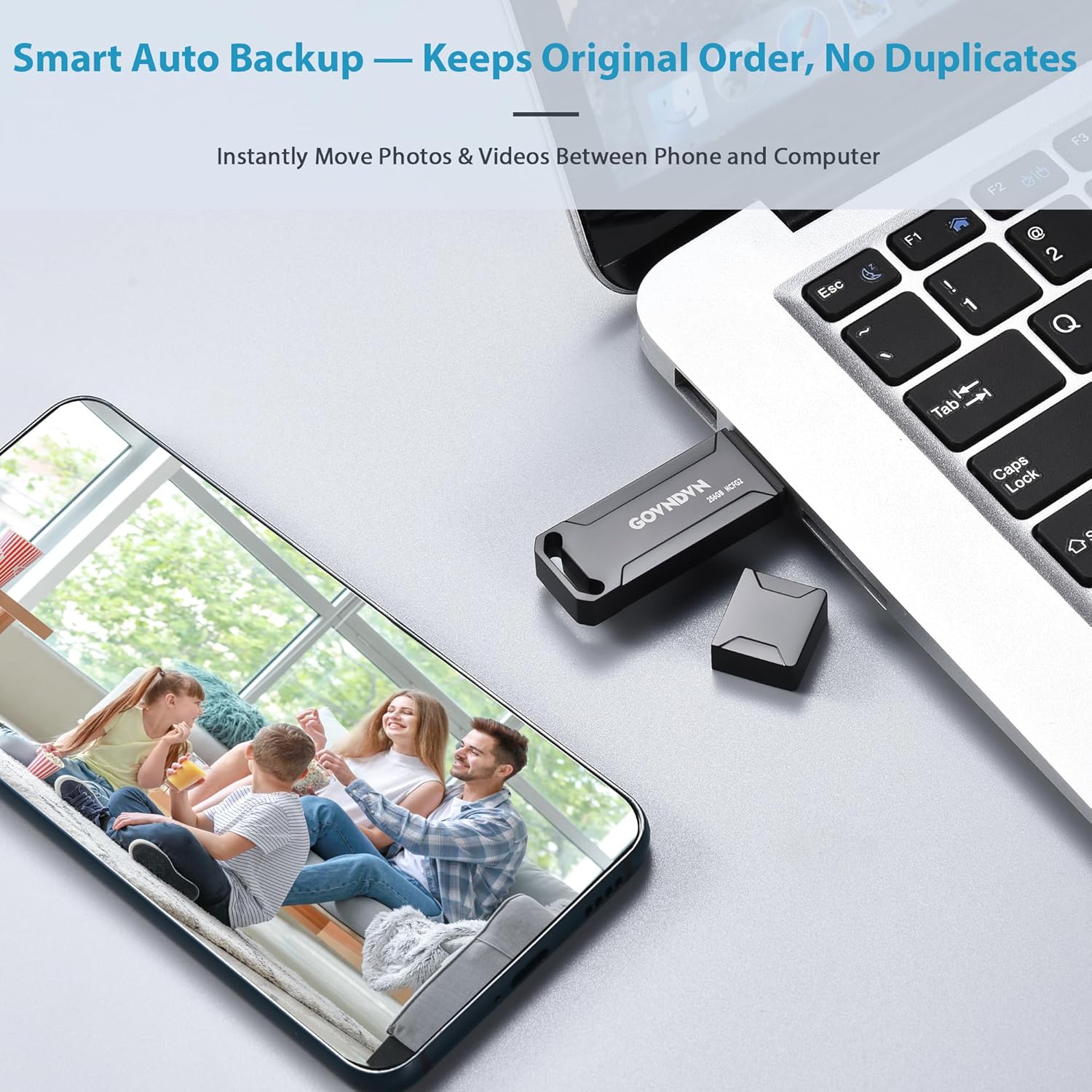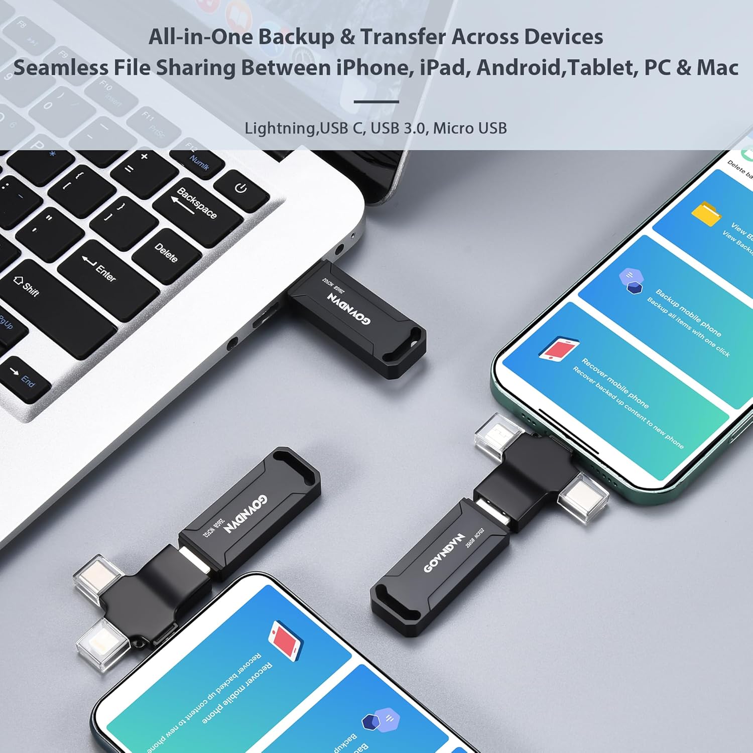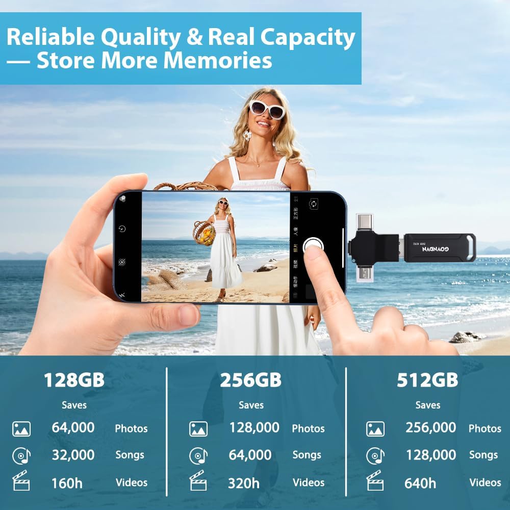 🎄🎁 Automatic Backup for All Devices — Simple & Stress-Free: The GOVNDVN photo stick is an iPhone backup flash drive that automatically backs up photos, videos, and contacts across iPhone, iPad, Android, Mac, and Windows PC. With Lightning, USB-C, USB 3.0, and Micro USB connectors, one USB drive protects all your devices — fully offline with no cloud or subscription. Simply plug in the photo stick to start iPhone photo backup and secure photo and video storage effortlessly.