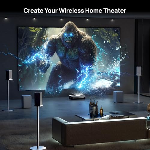 AWOL Theater 5.2.2 Surround System: The brightest RGB laser projector meets the powerful 5.2.2 wireless surround sound system. With our exclusive center speaker mapping technology, AWOL projector functions as a dedicated center speaker, enhancing dialogue clarity and visual cohesion. This technology improves dialogue focus, ensuring every spoken detail is clear and lifelike. Paired with a 4.2.2 speaker configuration, the system delivers an immersive 5.2.2 experience that brings movies and shows