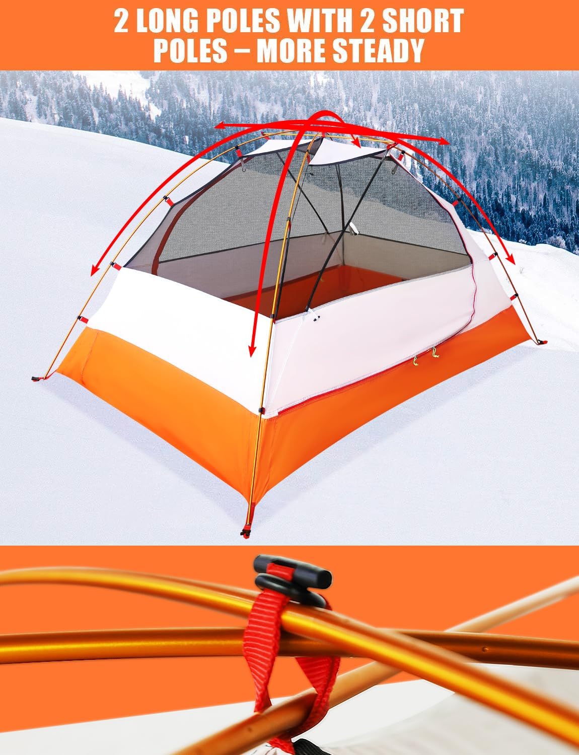 This is an Easy Setup Tent with 2 Poles: The 4-Season backpacking tent is designed with two poles for cross-installation and a small center pole for added support. This allows you to quickly set up or dismantle the tent within 3 minutes. The innovative crossed pole design enhances stability, and the freestanding feature enables you to move and relocate the tent without the need for disassembly. It’s user-friendly, providing a seamless camping experience.