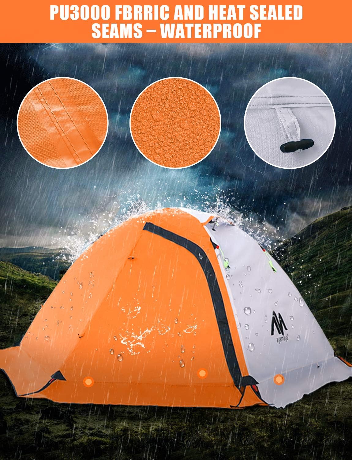 This is a Waterproof & Lightweight Backpacking Tent: This tent is made of 3000MM waterproof PU-Coated 210D Oxford groundsheet, 2000MM waterproof PU-Coated 190T polyester fabric roof, 190T polyester breathable inner wall with large B3 no-see-um mesh wall. Heats sealed seams in the connection area prevent leaking water, keep you dry inside. Using 7.9 mm 7001 aluminum pole, tent total weight only 5.7 lbs, super lightweight, easy to carry.