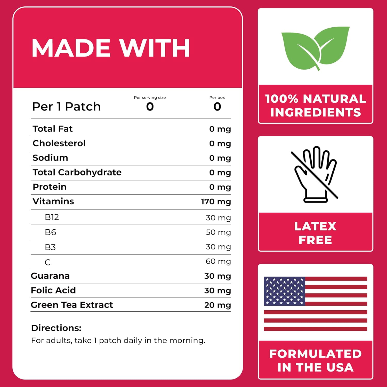 💫 EFFECTIVE FORMULA – The B12 Patches Are Formulated for Maximum Results. Vitamin B12 for Enhanced Energy and Tightening Your Muscles, Vitamin C for Strengthening The Immune System And Improving Your Mood, Guarana for Improved Mental Focus and a Firmer Look, Folic Acid for Mental and Physical Health, Green Tea Extract for Relaxation and Improved Sleep.