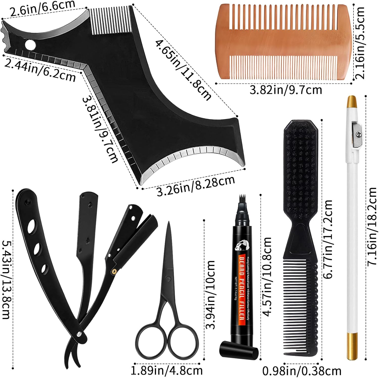 Professional Definition & Coverage: Beard shaping tools include a beard guide template for uniform outlines and barber pencil to conceal patchiness, creating fuller-looking beards with structured edges