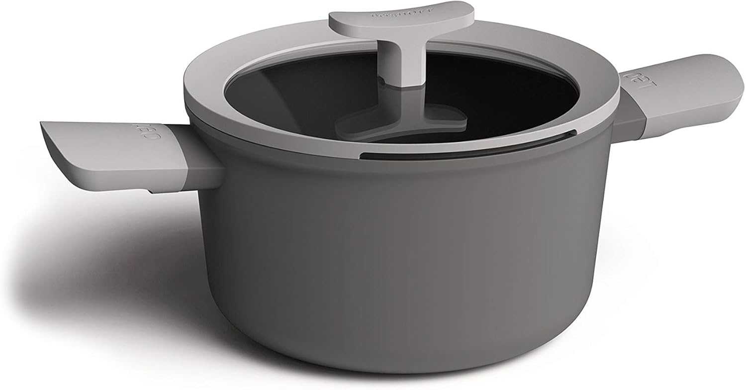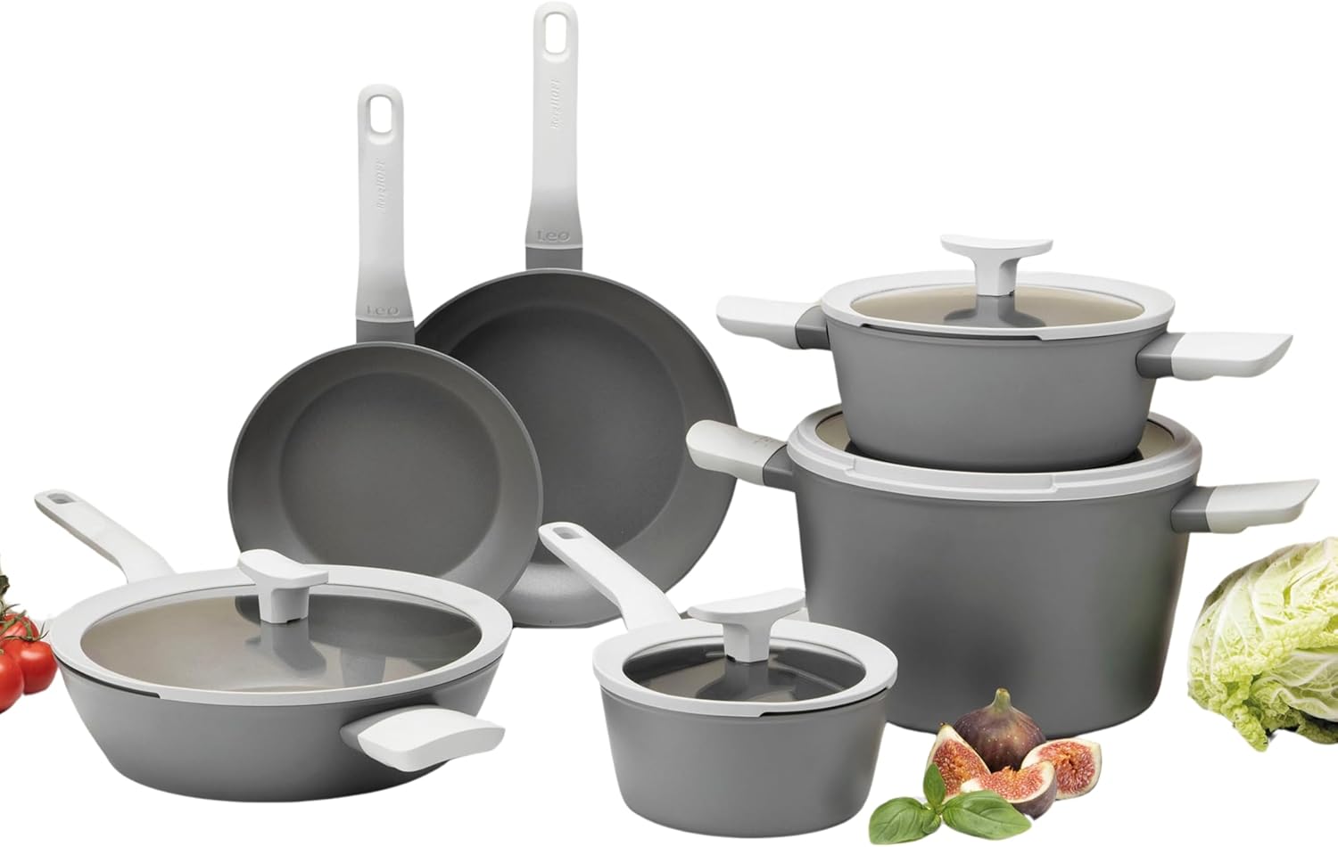 BergHOFF Leo 10Pc Non-stick Ceramic Cookware Set With Glass Lid, Cast Aluminum, Non-toxic, CeraGreen Nonstick Coating, Stay-cool Handle, Induction Pots and Pans, Grey
