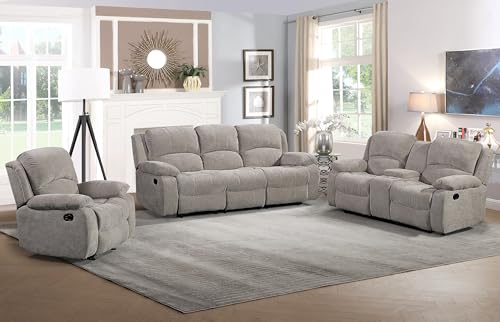 Betsy Furniture Soft Microfiber Reclining Sofa Set, Drop Down Table, Cupholder Console, Living Room Set, Sofa Loveseat Glider Chair 8018M (Light Grey, Sofa+Loveseat+Chair)