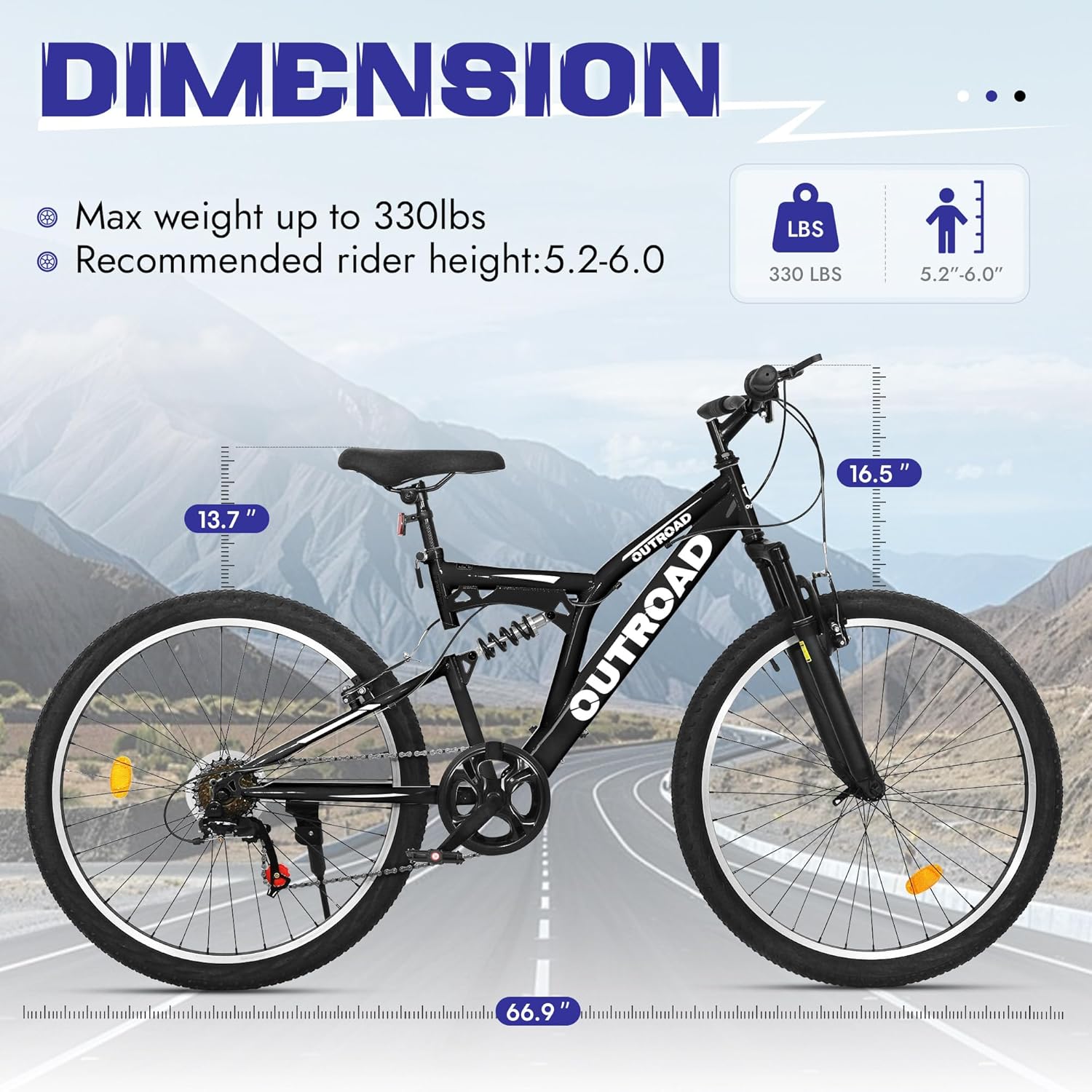 Specification: Betterland Mountain Bike, 26 inch Outdoor Bikes, 7-Speed &High-Carbon Steel Cycing Bicycles, Dual Suspension Fork for Men Women Adult, MTB Bicycle with Adjustable Ergonomic Seat