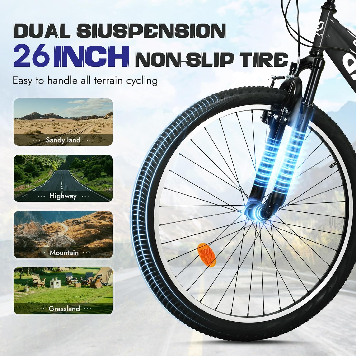 Betterland Mountain Bike, 26 inch Outdoor Bikes, 7-Speed &High-Carbon Steel Cycing Bicycles, Dual Suspension Fork for Men Women Adult, MTB Bicycle with Adjustable Ergonomic Seat