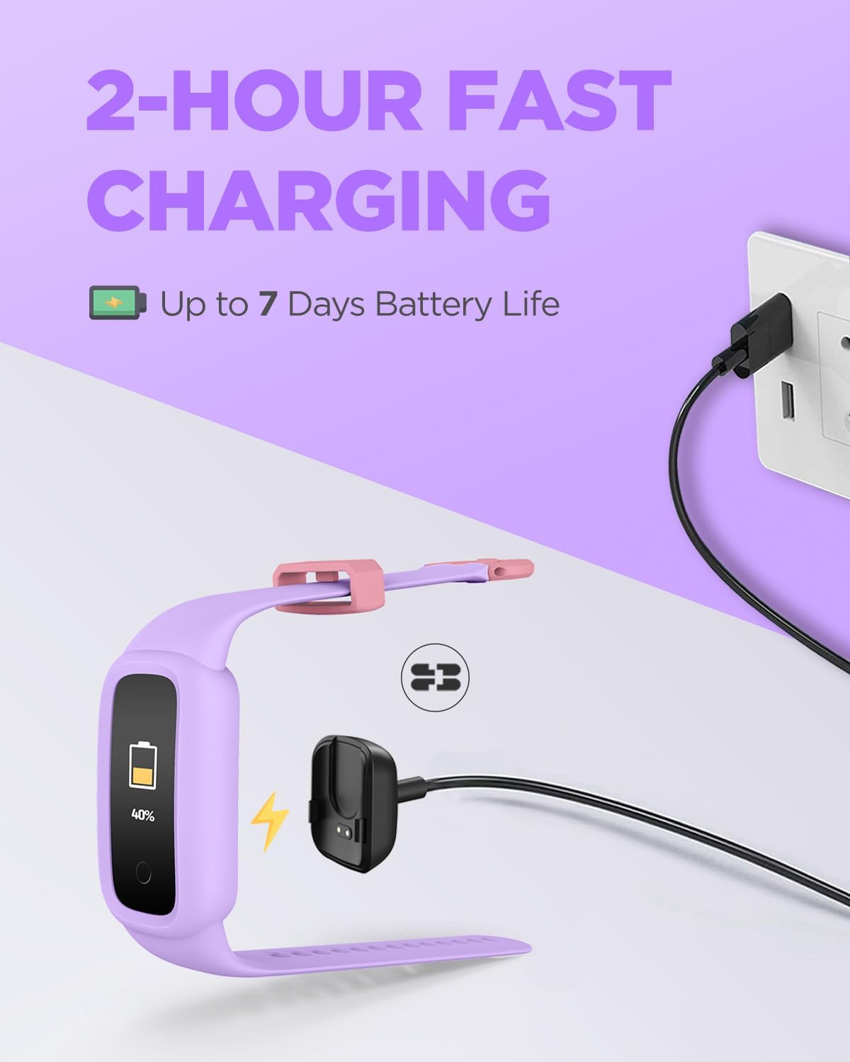 [COMFORTABLE BAND & LONG BATTERY LIFE] Crafted with a soft, lightweight silicone band, this kids pedometer is designed for all-day comfort. Enjoy a long-lasting battery life of up to 7 days on a single charge, with just a 2-hour recharge time.