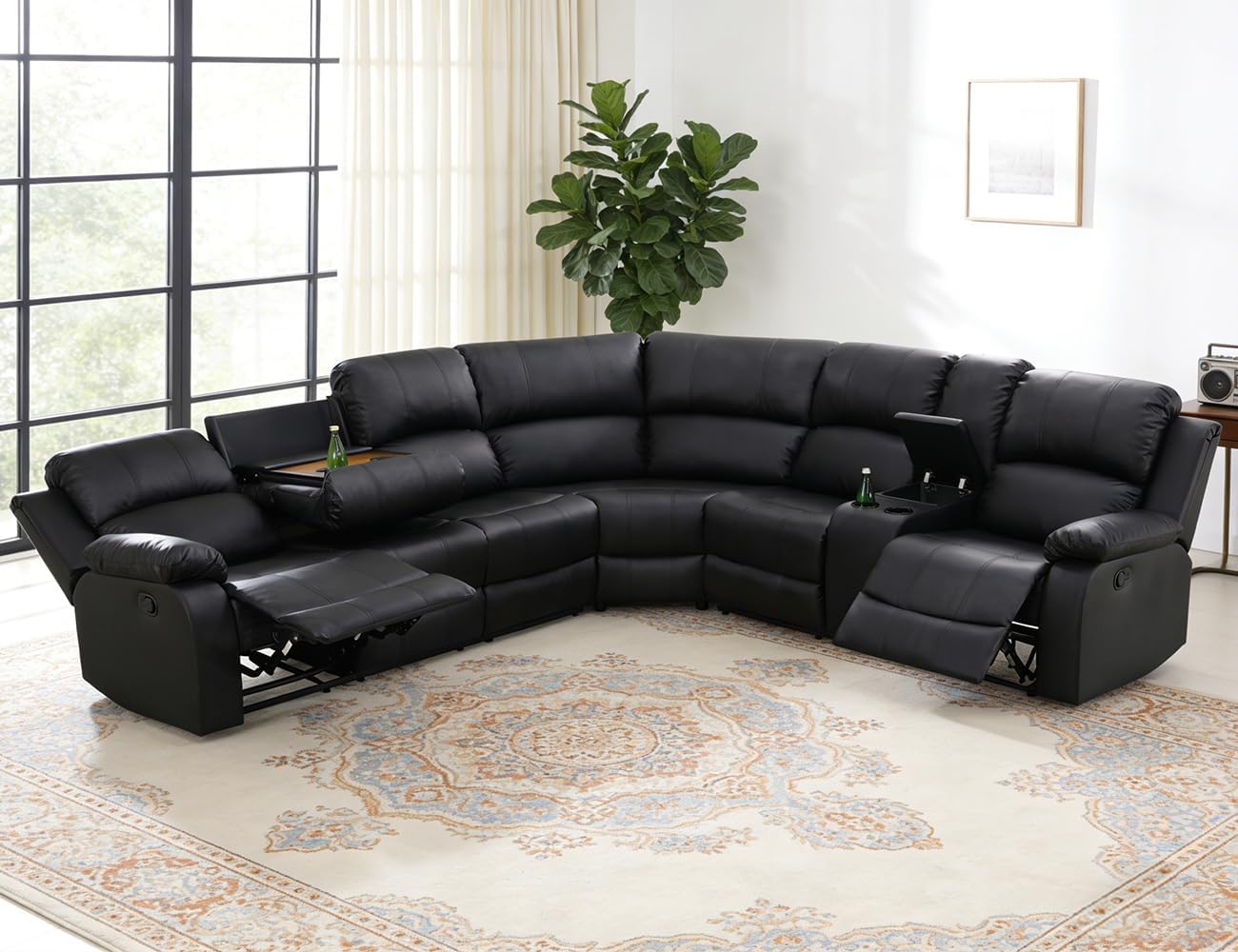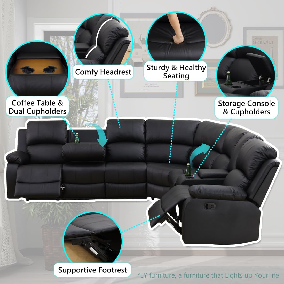 Built-in Cup Holders & Coffee Table: Convenient cup holders in the sofa and loveseat sections keep drinks within arm’s reach, preventing spills. The handy drop down coffee table on the sofa part is ideal for snacks, remote controls, or devices, turning the sofa into a hub for entertainment without leaving the comfort of your seat. Both two side seats of the sectional are recliners, kick back to watch TV, read, or take a nap, easily adjusting to your ideal angle for ultimate relaxation.