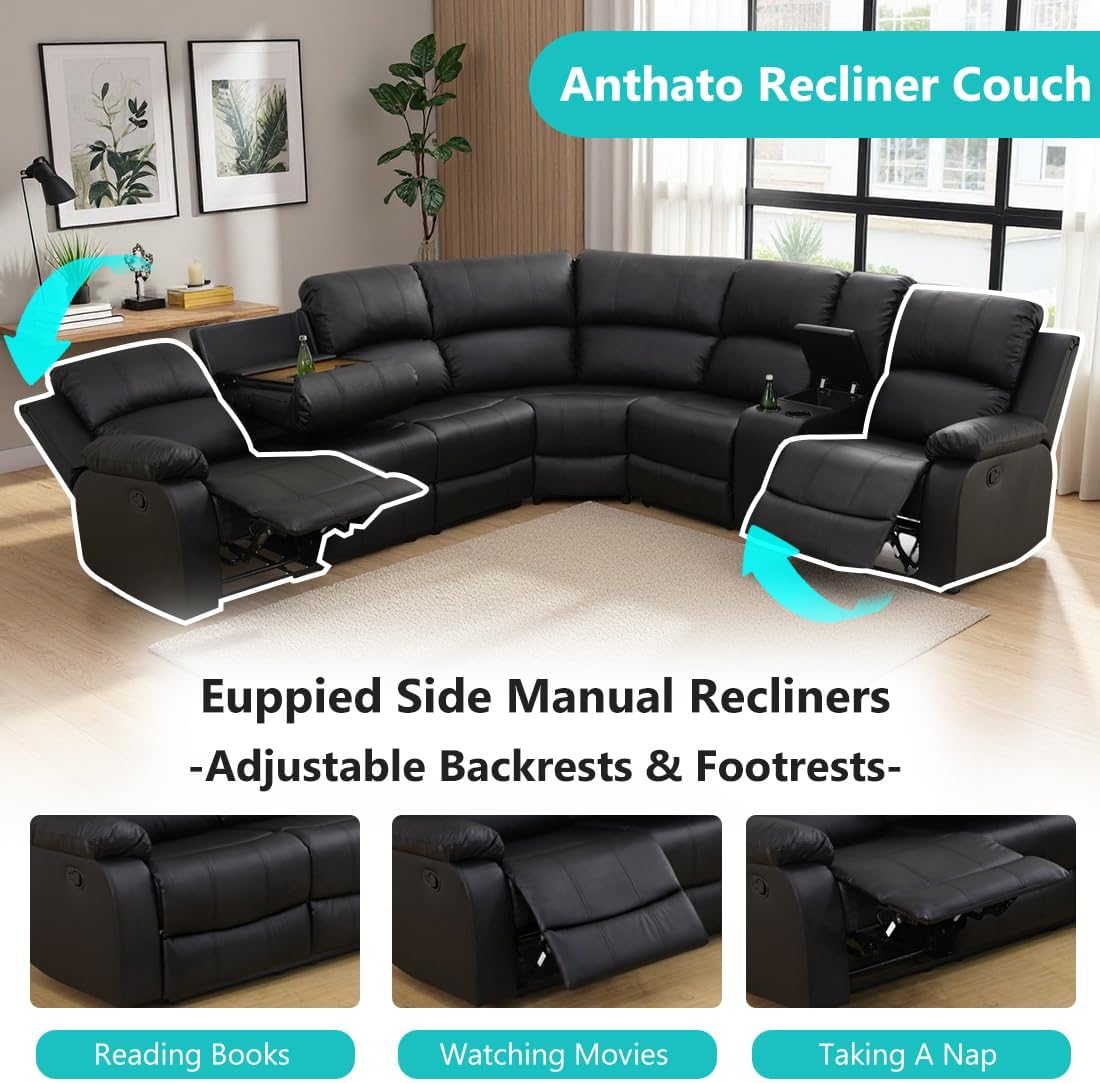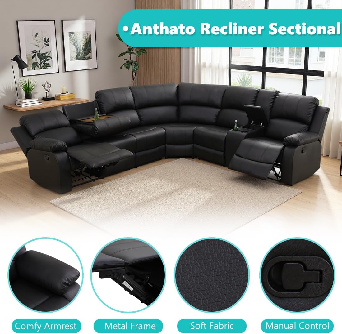 Black Leather Reclining Sectional Sofa Set, Living Room Furniture Sets, Faux Leather L-Shaped Sectional Couch, 6-Seat Manual Recliner Couch with Coffee Table/Cupholders/Storage for Home/Office