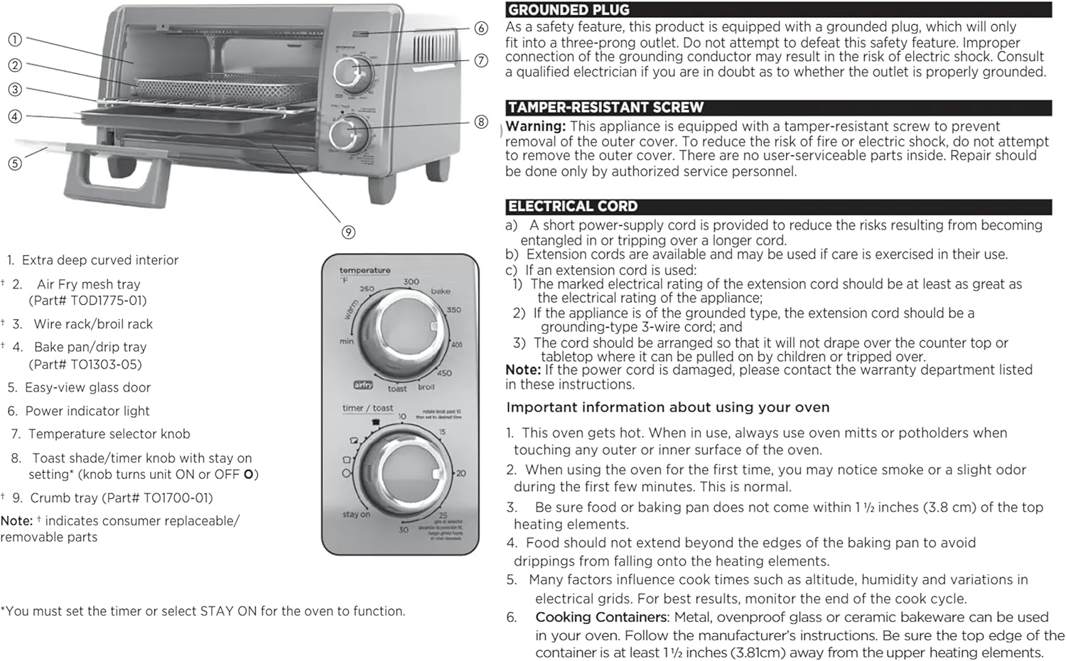 Deep fried taste without the fat! This oven features Air Fry Technology, which uses high intensity hot air to bake, brown, and crisp your favorite fried foods with little to no oil. The included air fry mesh tray allows hot air to surround food for fast, crisp results. Two control knobs simplify cooking, letting you set the 30-minute timer and choose from five cooking functions: Air Fry, Bake, Broil, Toast, and Keep Warm. On the toasting function, Even Toast Technology™ evenly distributes heat and infrared energy to optimize even toasting. The interior is large enough to fit up to 4 slices of bread or a 9” pizza, and it’s great for fresh or frozen snacks. Innovative features and reliable performance help make BLACK+DECKER the #1 brand in toaster ovens*. We stand behind our appliances with a 2-year limited warranty so you and your family can depend on them in your kitchen.