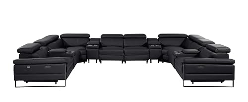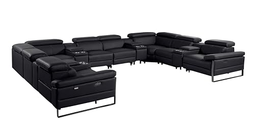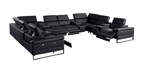 BlackJack Furniture Antonio 12 Piece U Shaped Power Reclining Sectional Sofa, Modular Couch with Top Grain Italian Leather, 4 Electric Recliners, USB & Wireless Chargers, Storage Console, Black
