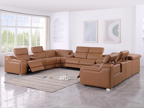 Blackjack Furniture Ibero 12-Piece Top Grain Italian Leather Sectional Reclining Sofa Set with 4 Power Recliners, Power Adjustable Headrests, USB and Wireless Phone Charger and Console Storage, Cognac