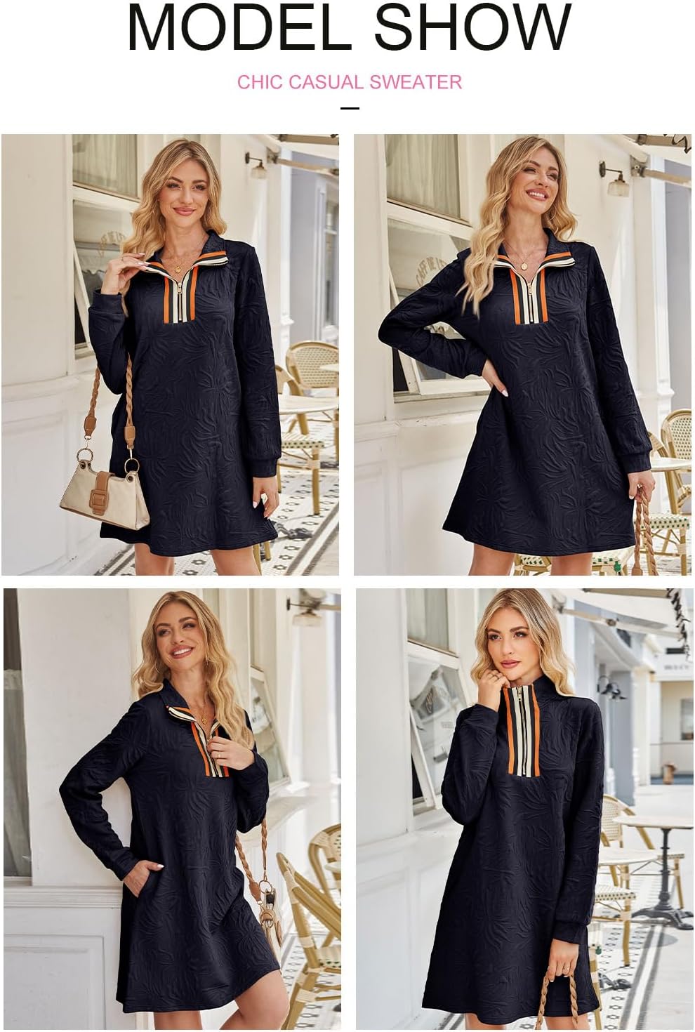 The video showcases the product in use.The video guides you through product setup.The video compares multiple products.The video shows the product being unpacked. BLENCOT Casual Zip Up Stand Neck Sweatshirt Dress Merchant Video