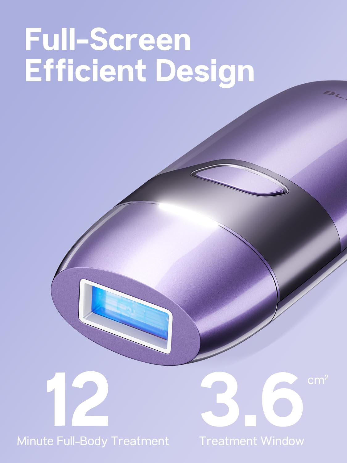 【Full-Screen Efficient Design】Blex mini significantly improves the hair removal efficiency with the upgraded Full-Screen window design. This increases the working area to 3.6cm², you can complete full-body hair removal in just 12 minutes, saving you precious time.