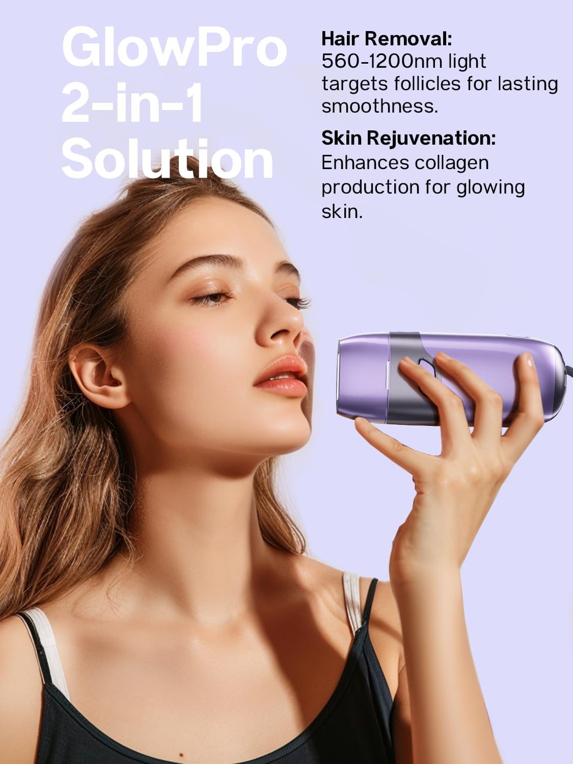 【GlowPro 2-in-1 Solution】Utilizing industry-leading technology, Blex laser hair removal system not only effectively eliminates unwanted hair but also enhances skin elasticity and texture. With the 560-1200nm broad-spectrum light, Blex mini enhances collagen production,giving you smooth and rejuvenated skin.