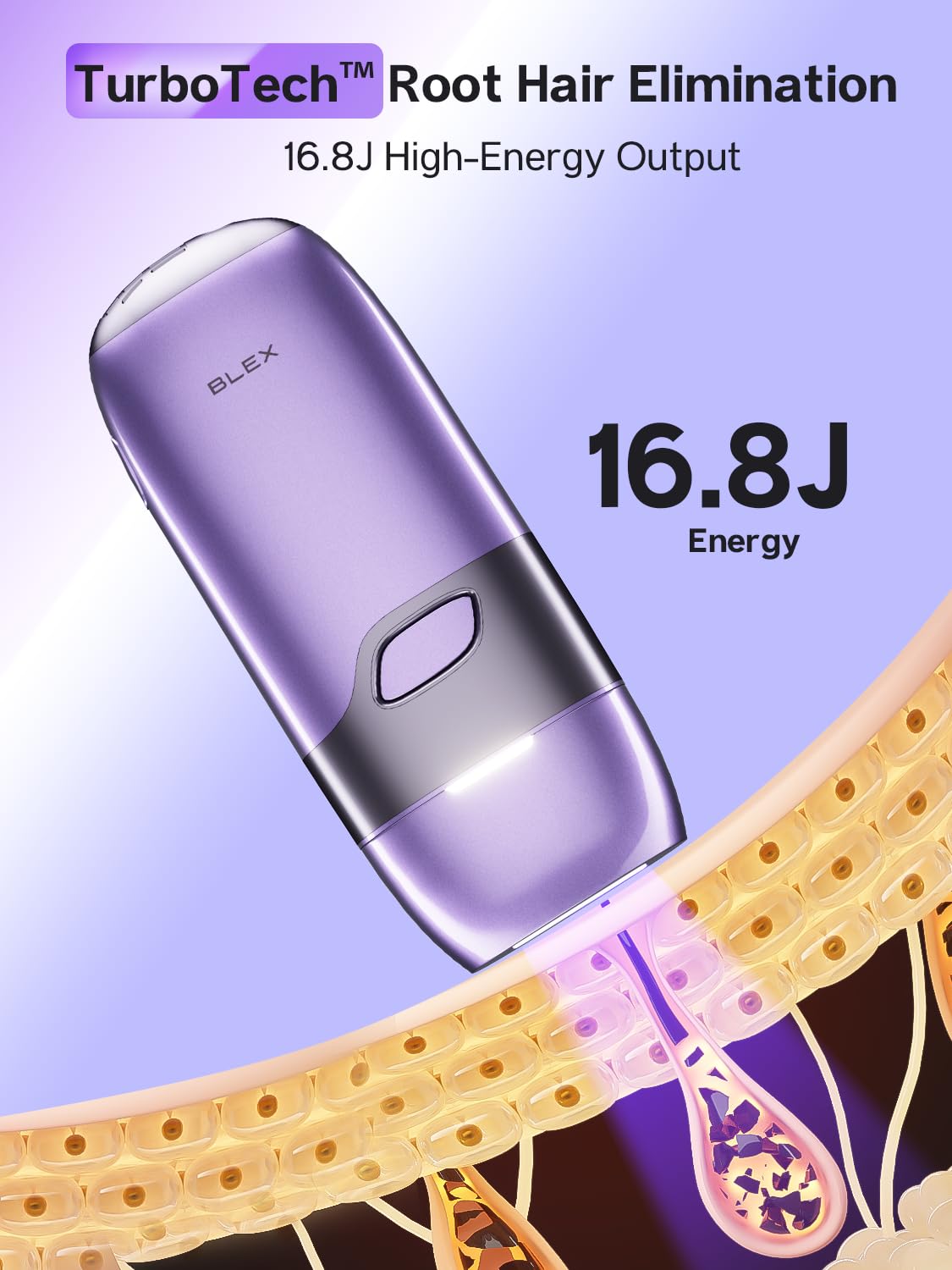 【TurboTech Root Hair Elimination】Visible results in just 4 weeks with consistent usage. Adopting the new generation root hair elimination technology TurboTech, Blex laser hair removal machine precisely targets the hair root follicles on various body parts, including the face, bikini area, armpit, legs, back, chest, arms, chin, and lips, providing a professional, painless, and long-lasting hair removal experience.