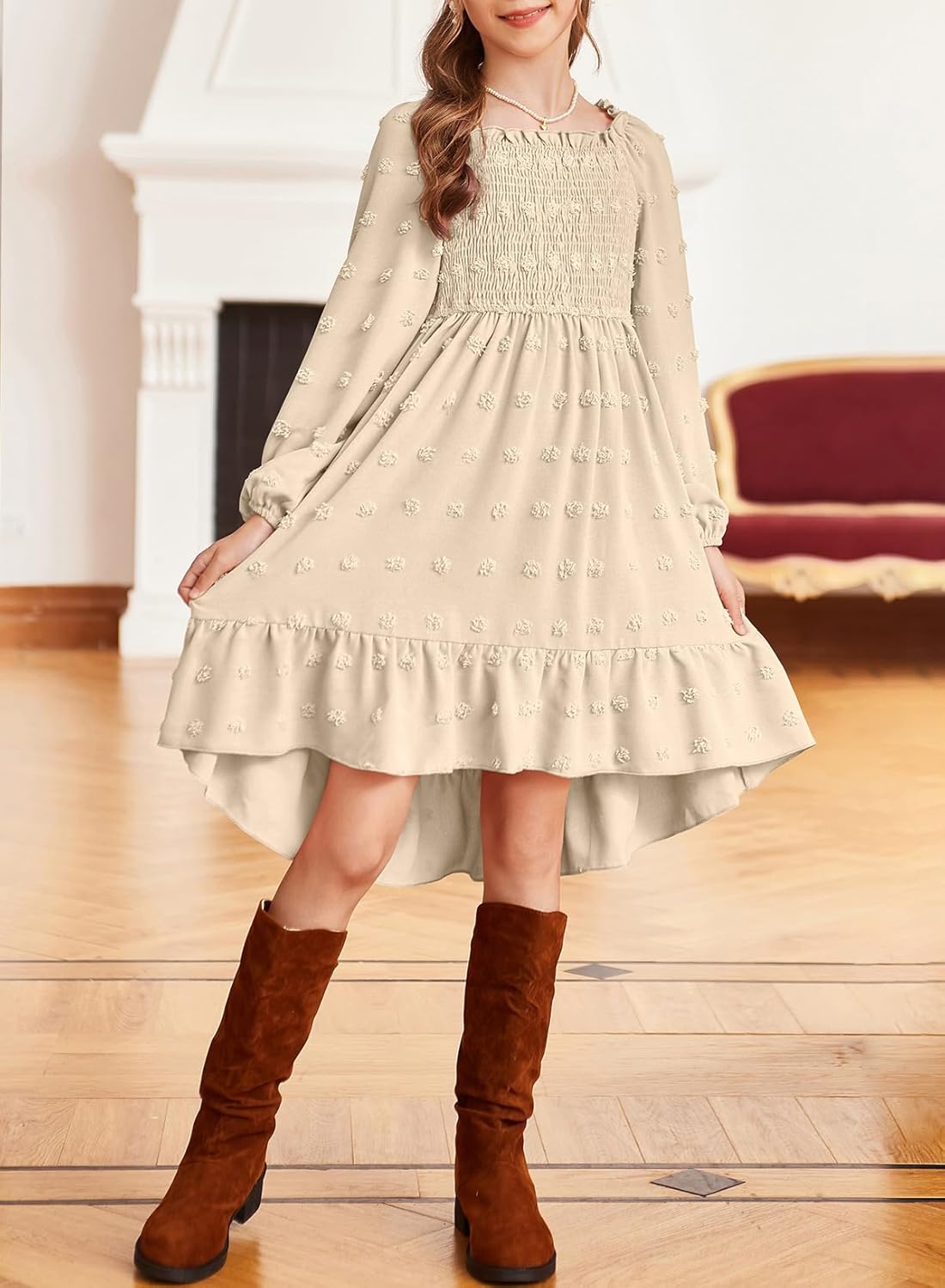 The video showcases the product in use.The video guides you through product setup.The video compares multiple products.The video shows the product being unpacked. Girls 2025 Long Sleeve Polka Dots Pockets Dress Merchant Video