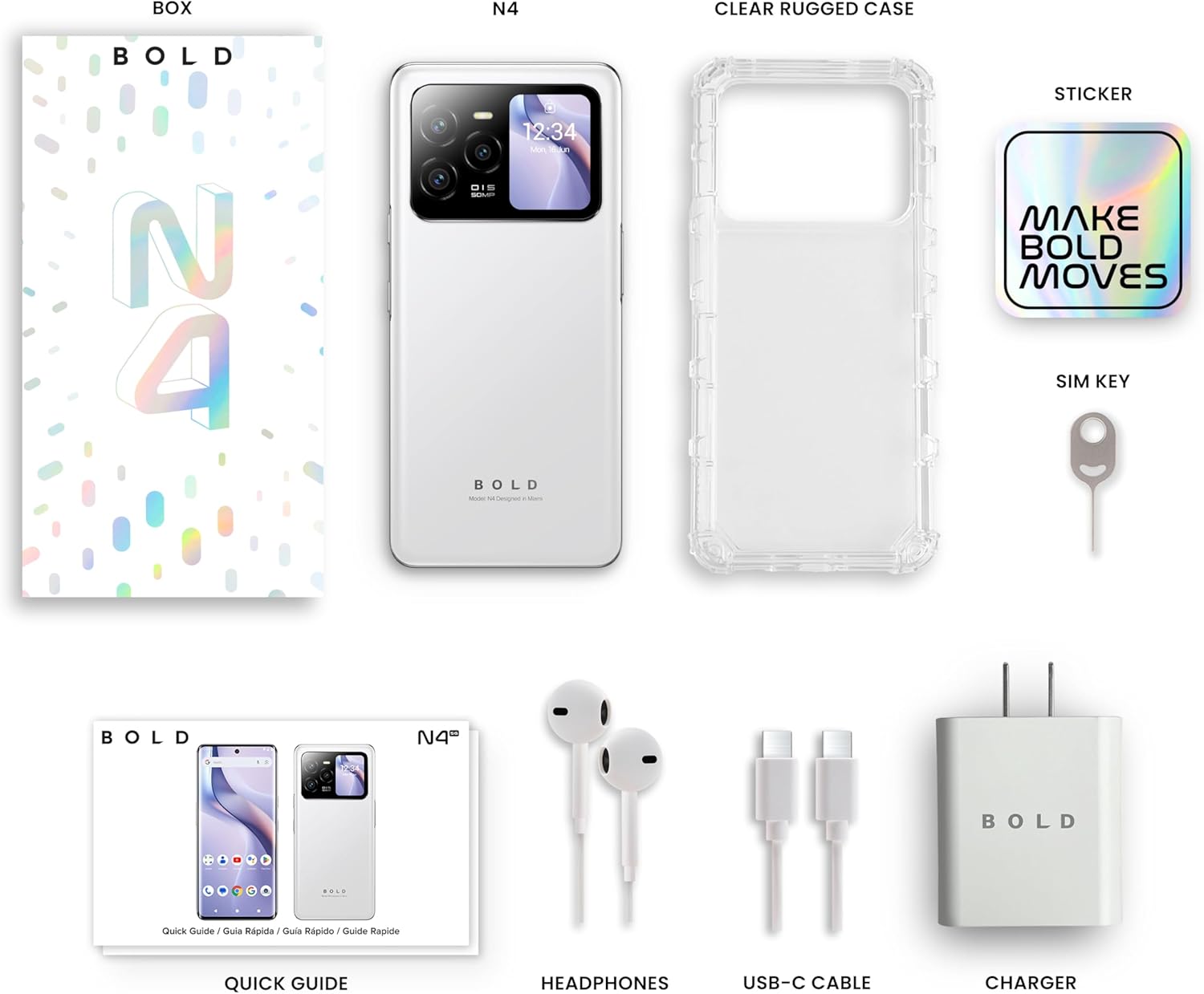 Specification: BLU Bold N4 5G | Unlocked | 6.78” Curved Display + 1.74” Rear Display | 50MP + 16MP Selfie | 512/8GB I NFC I Android 15 | US Version | US Warranty | White
